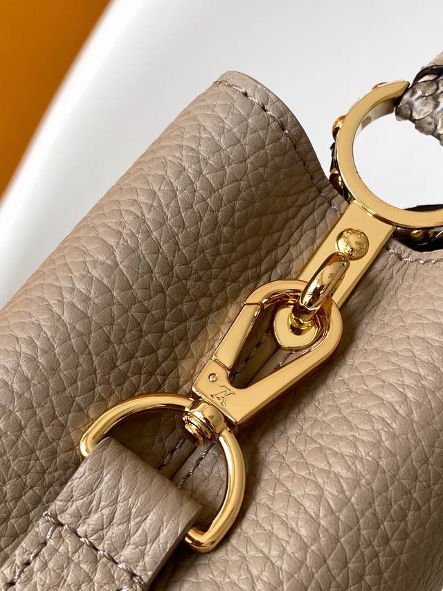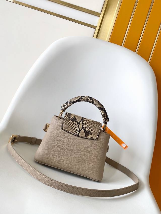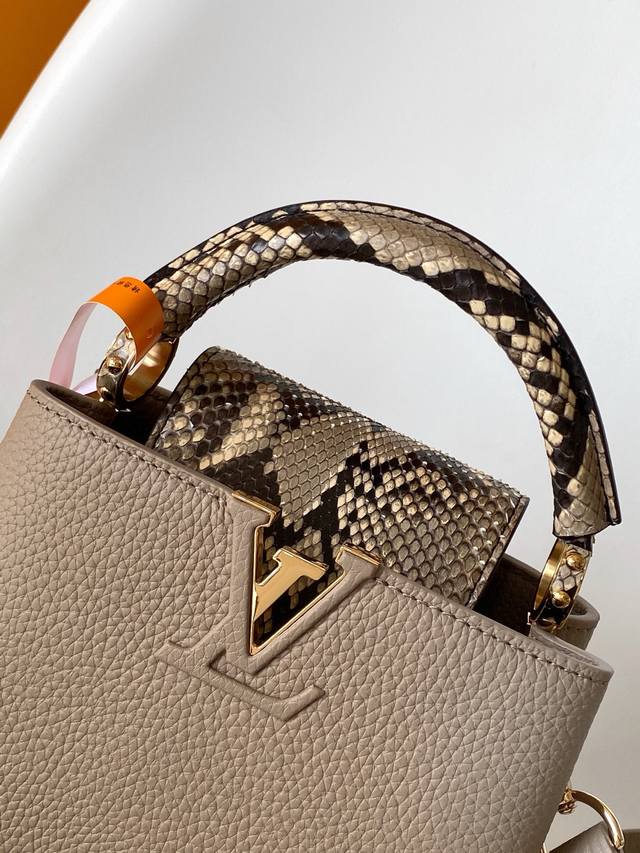 N85515 White, N85514 Black, N85513 Black, N85516 Black, N85517 Grey, Premium Original Dynamic 163. The summer Capucines mini handbag is crafted from Taurillon cowhide leather, with the handles and Lv logo wrapped in luxurious python leather, adding an exotic touch to the iconic design. The detachable shoulder strap allows for comfortable shoulder or crossbody carry.