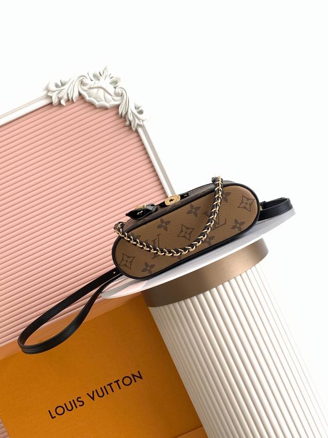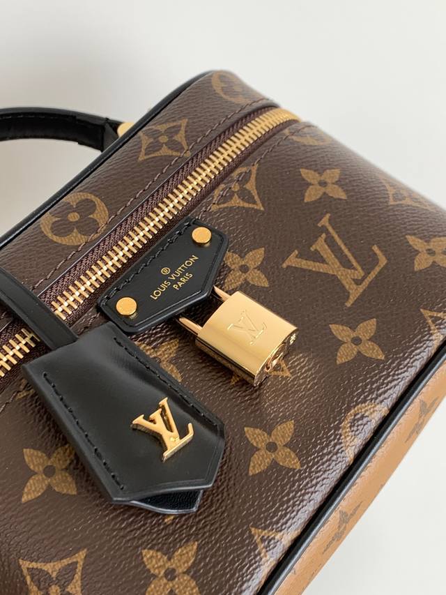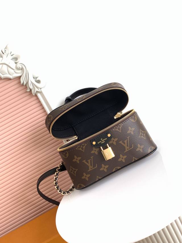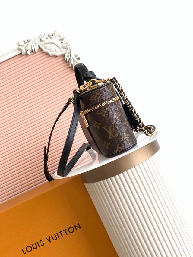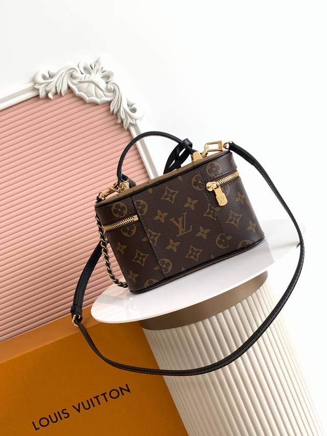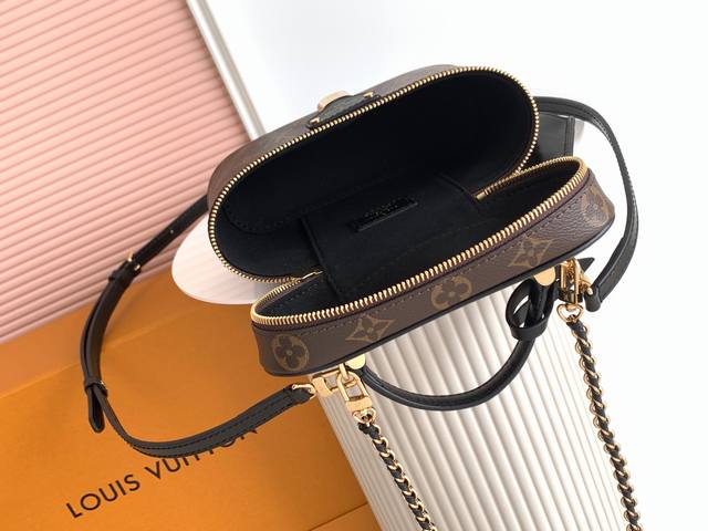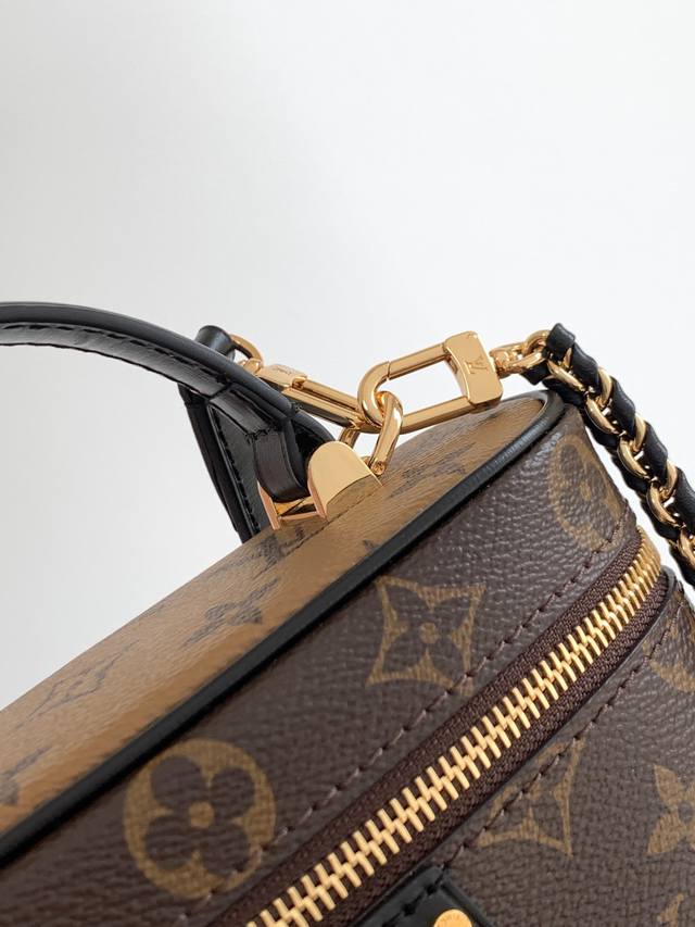 Vanity Chain Pouch draws inspiration from the classic vanity case, embodying the spirit of travel in Monogram canvas. The top handle and detachable braided chain incorporate leather accents, complementing the clean lines of the bag. An Lv-inscribed padlock and leather key holder continue the iconic details.
