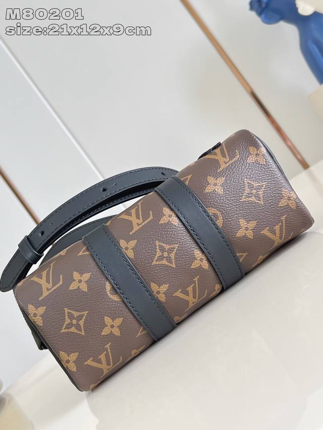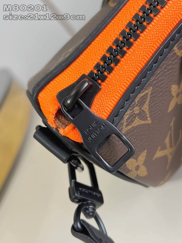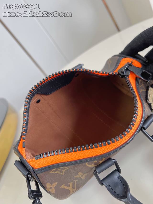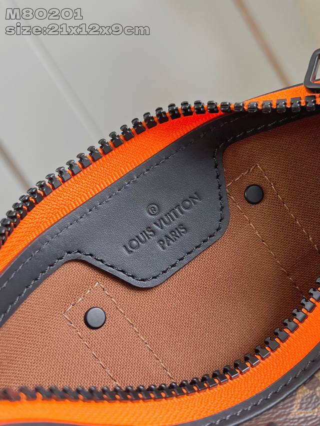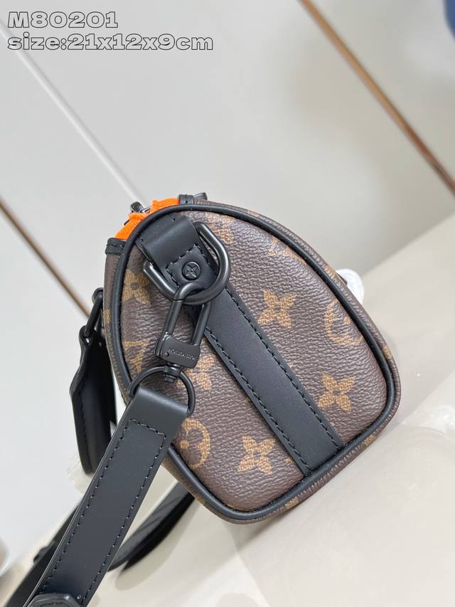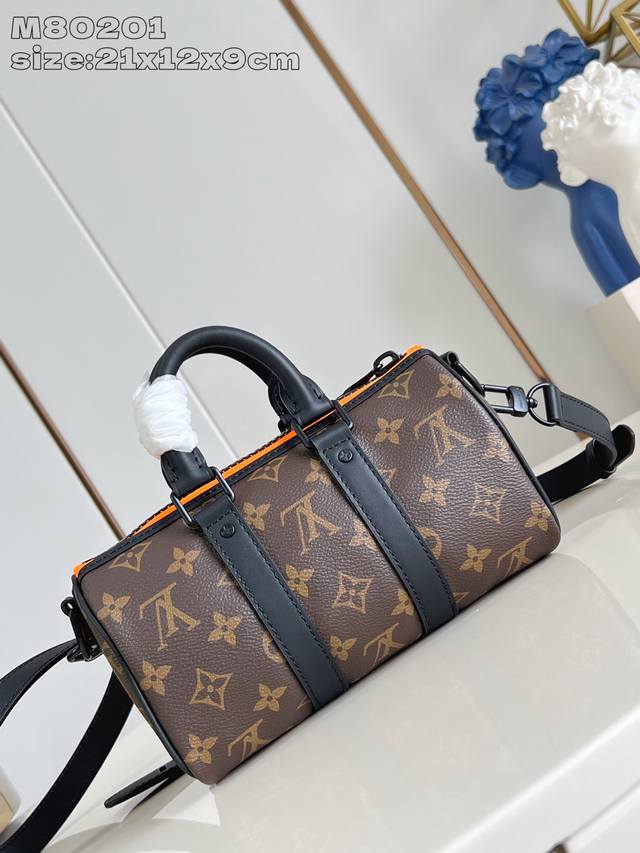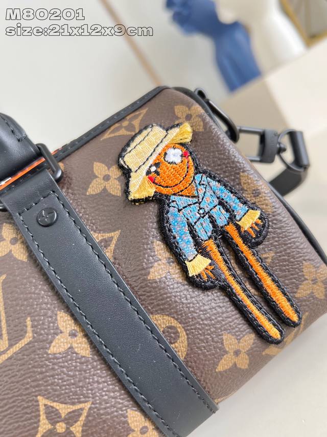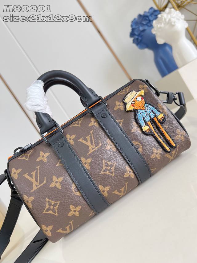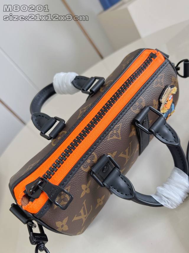 Exclusive photo M80201 This Keepall Nano men's handbag is a smaller version of the brand's original soft travel bag launched in 2017, combining Monogram canvas with matte black leather. A touch of fluorescent orange along the zipper edge adds a touch of shine to this classic Louis Vuitton shape. The embroidered patch features cartoon characters from Virgil Abloh's "Zoom With Friends" animated short film. Dimensions: 12 x 21 x 9 cm