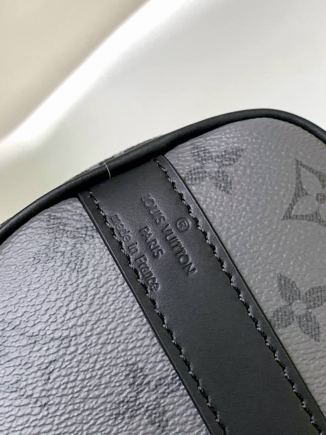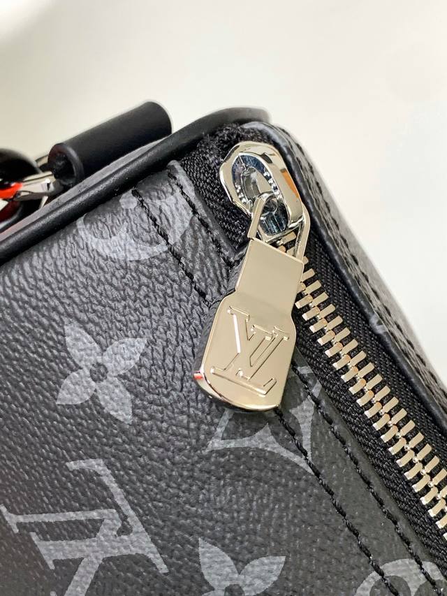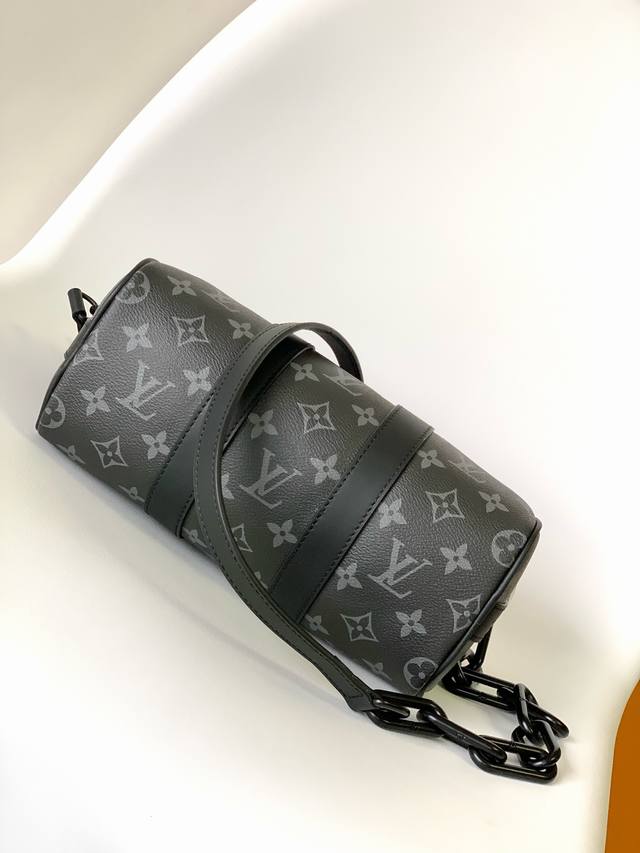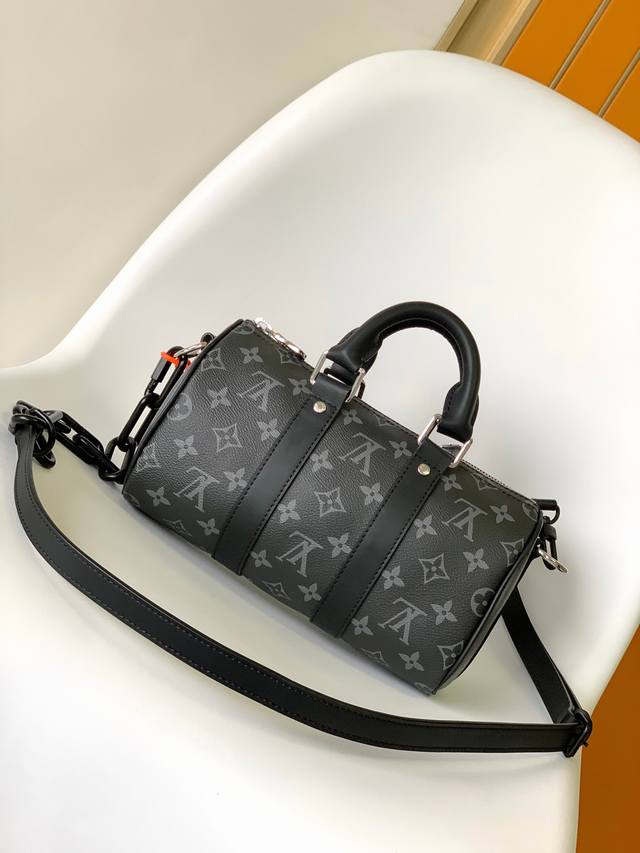 Original M46271 chain pillow bag in black and orange. This Keepall 25 handbag is crafted from Monogram Eclipse Reverse canvas, an elegant reinterpretation of Louis Vuitton's classic motif. The reinforced straps and leather nameplate are signature elements of the Keepall line, while a zipper closure keeps personal belongings securely on the go. Dimensions: 25.0 x 15.0 x 11.0 cm (Length x Height x Width) (
