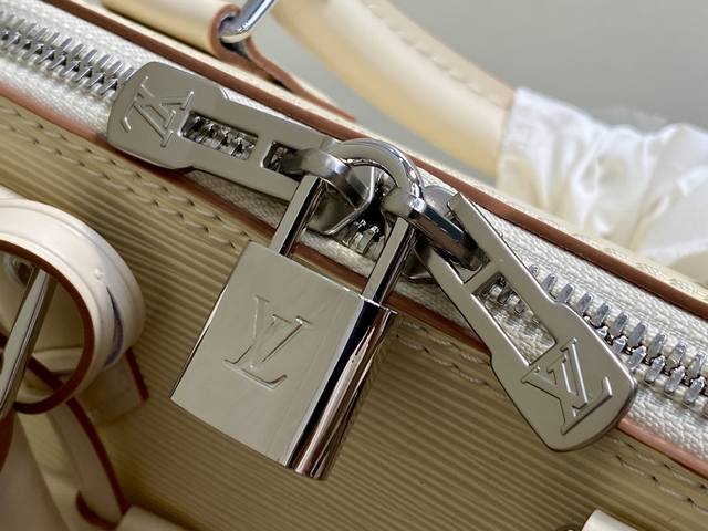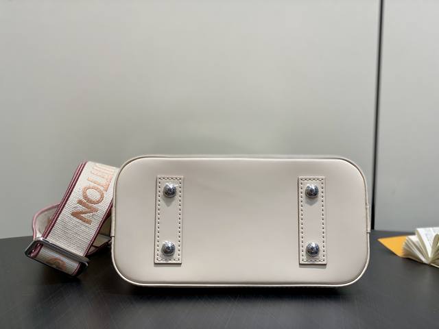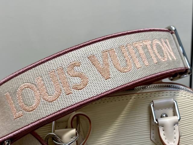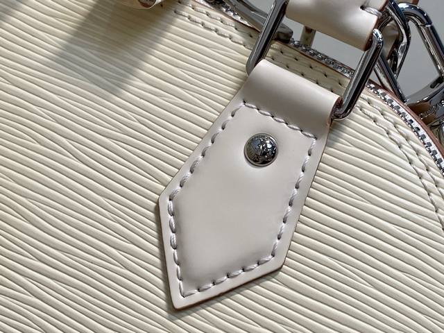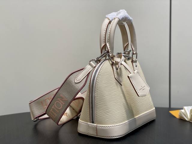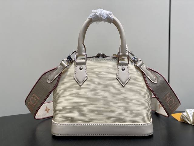 Original Quality M14432 White Epi Leather Shell Bag (Alma Bb). As one of Louis Vuitton's iconic designs, the Alma Bb handbag is crafted from Epi leather. The new jacquard wide shoulder strap features Louis Vuitton logo embroidery and Monogram floral clusters on both sides, with delicate stitching outlining the edges, instantly capturing attention. Detailed Features: 23.5 x 17.5 x 11.5 cm (Length x Height x Width)