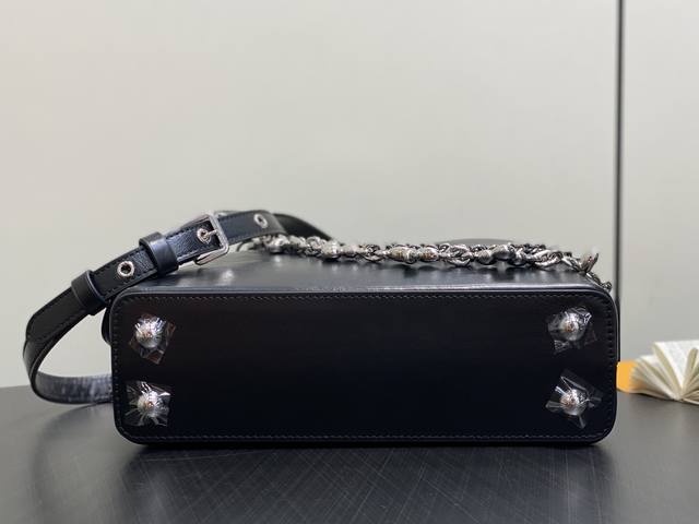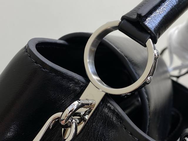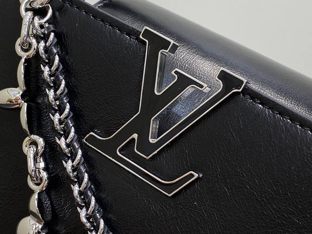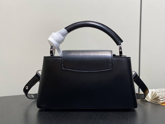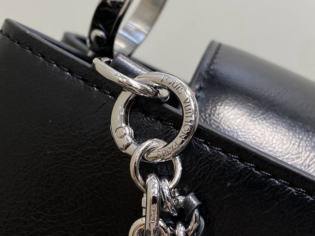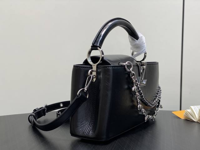 Original Quality M25473 Black Waxed Leather M25492 Chain Full Leather Capucines East-West BB Handbag (Na Ying Style). This small Capucines East-West handbag draws color inspiration from the Louis Vuitton Beauty collection, subtly exuding an air of sophistication. The pleated leather body releases an avant-garde feel, paired with a flap that can be folded inwards or outwards. The LV monogram highlights the brand's signature, and the shiny chain can be detached at will. 16 X 9 X 29 cm (H x W x Length) DDD