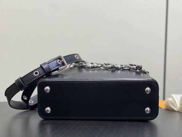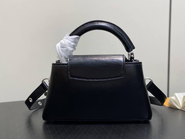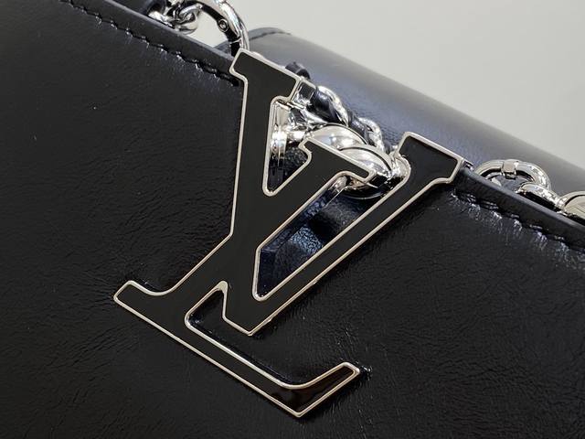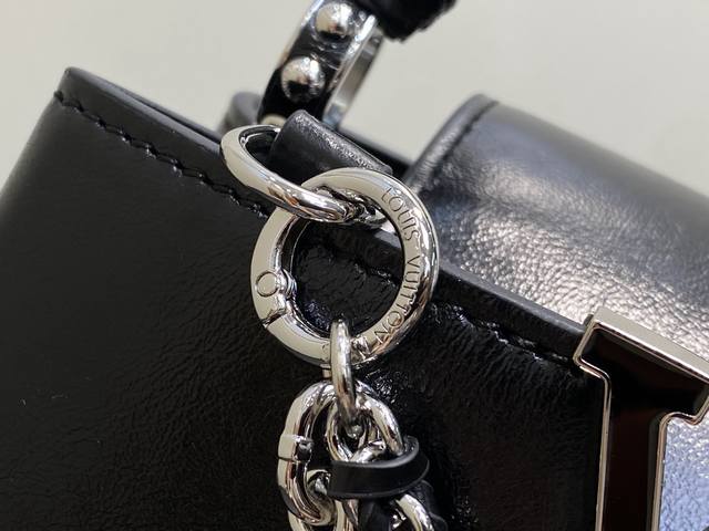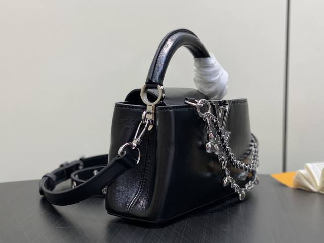 Original Quality M25473 Black Waxed Leather M25492 Chain Full Leather Capucines East-West Mini Handbag (Na Ying Style) This Capucines East-West mini handbag draws color inspiration from the Louis Vuitton Beauty collection, subtly exuding an air of sophistication. The pleated leather body releases an avant-garde feel, paired with a flap that can be folded inwards or outwards. The LV monogram highlights the brand's signature, and the gleaming chain can be detached. 12 x 8 x 22 cm (H x W x Length) DDD