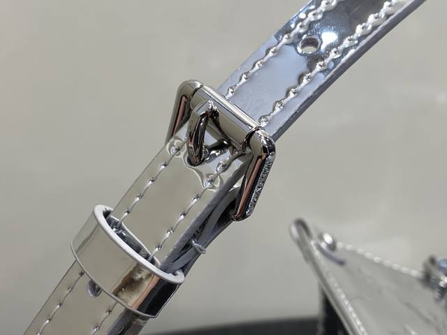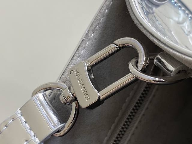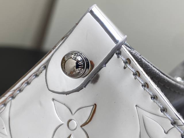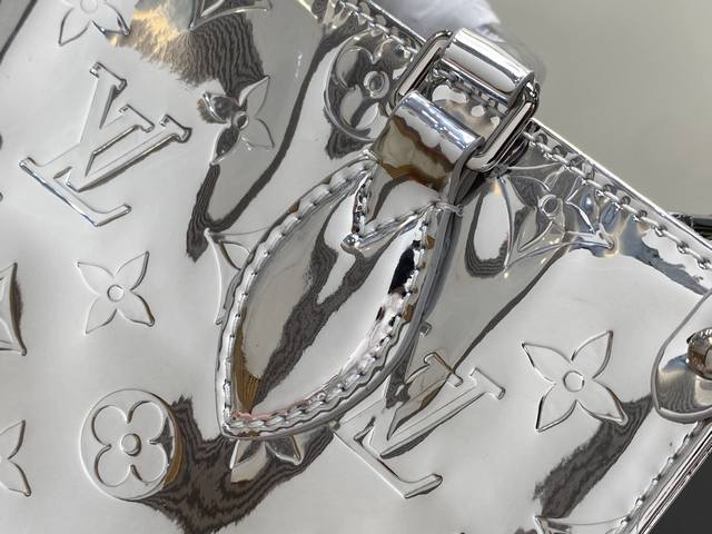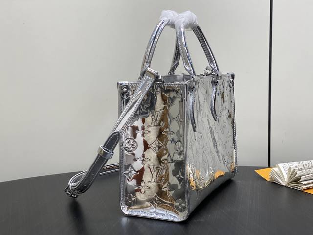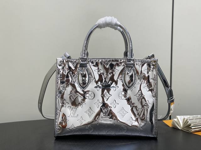 Original Quality M26373 Silver Mirror Patent Leather Small Square Bag, New Season Onthego Small Handbag. This Onthego small handbag joins the LV Ski series in the Monogram Miroir version. Coated canvas ensures durability. The silver tone and matching metal hardware create a dazzling effect. An interior pocket can hold small books and other everyday items. 19 x 11.5 x 25 cm (H x W x Length)