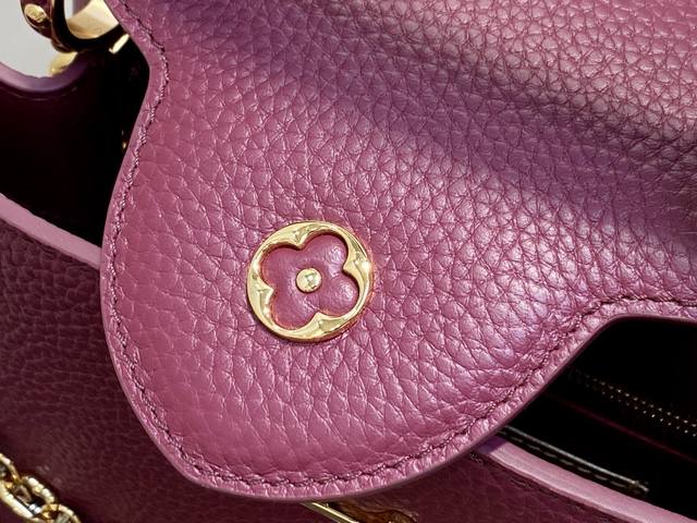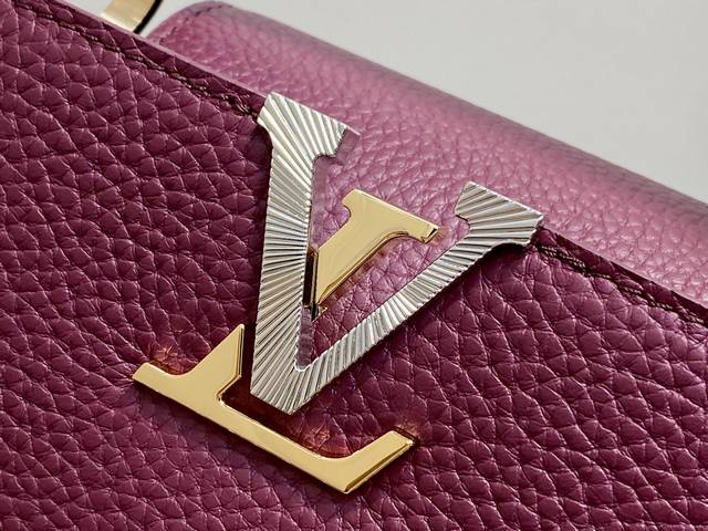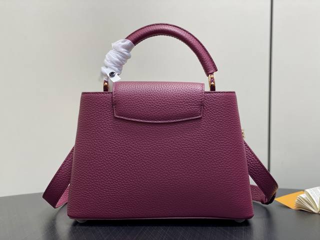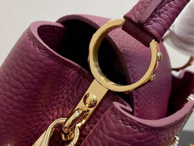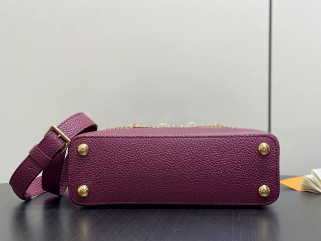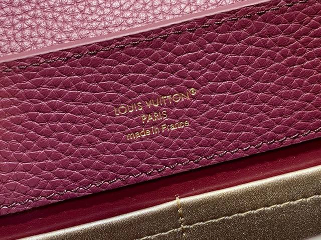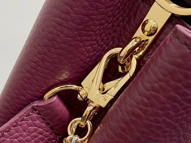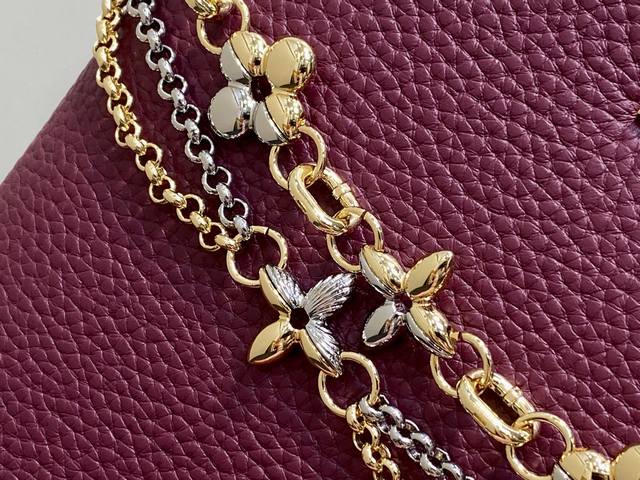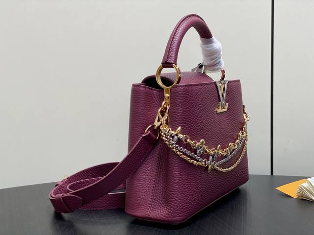 Original Quality M27035 Burgundy Full Leather Capucines Bag (Na Ying Style) Chain Bag. This Capucines mini handbag features a modern feel inspired by jewelry's infinity chain. A sophisticated piece for any occasion, from day to night. Made of classic black Toluon leather. Features double-galvanized hardware details, including the signature LV initials finished with Sorayyaju technology to achieve a Sunburst effect. Can be worn as a crossbody or shoulder bag using the detachable strap, or styled by carrying it by the top handle. Dimensions: 27 x 17 x 9 cm (Length x Height x Width).