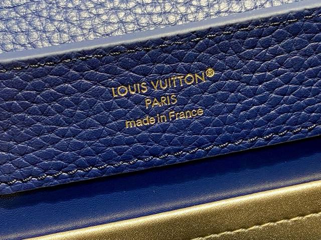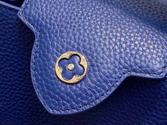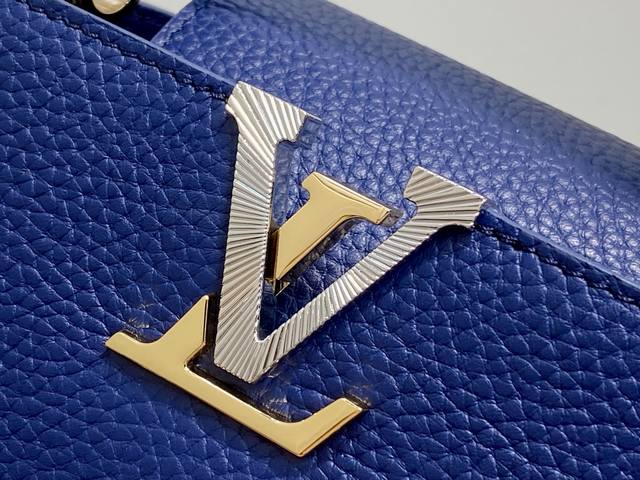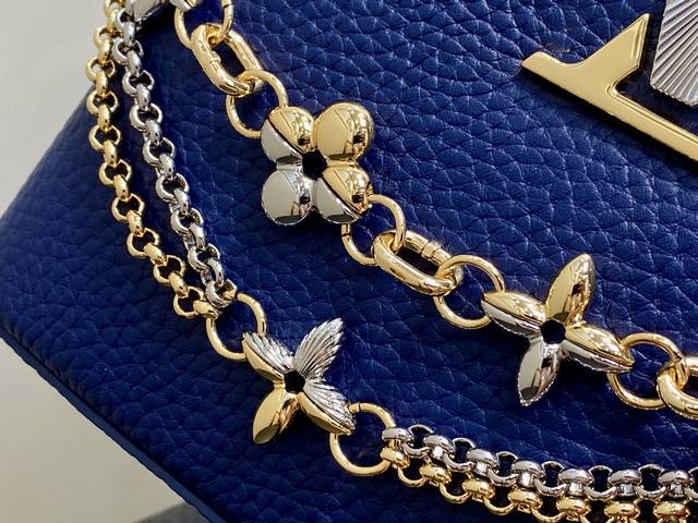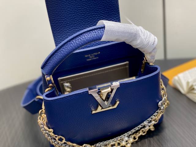 Original Quality M27035 Dark Blue Full Leather Capucines Mini Chain Bag (Na Ying Style). This Capucines Mini handbag features a modern feel with an infinite chain inspired by jewelry. A sophisticated piece that can be worn day or night. Made of classic black Toluon leather. Features double-galvanized hardware details, including the signature LV initials finished with Sorayyaju technology to achieve a Sunburst effect. Can be worn as a crossbody or shoulder bag using the detachable strap, or styled by carrying it by the top handle. Dimensions: 21 x 13.6 x 8 cm (Length x Height x Width).