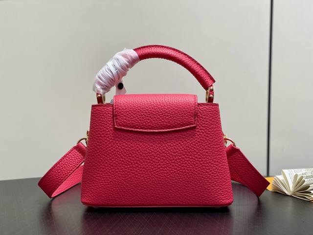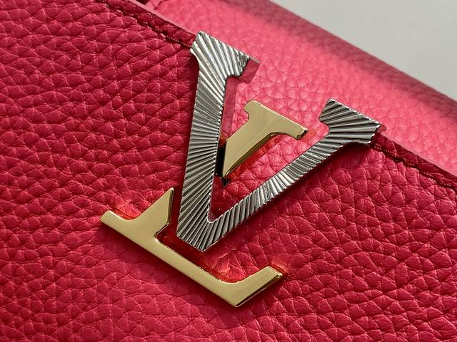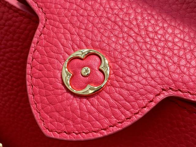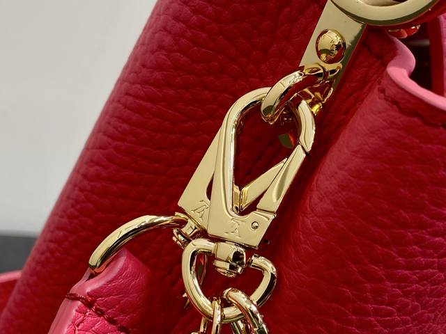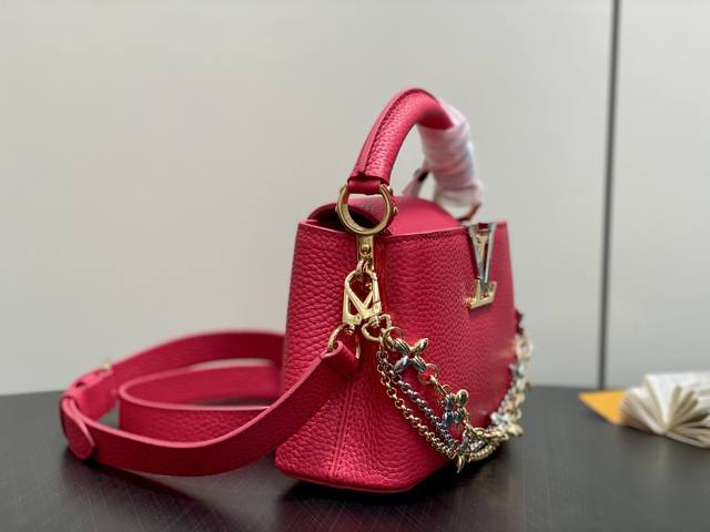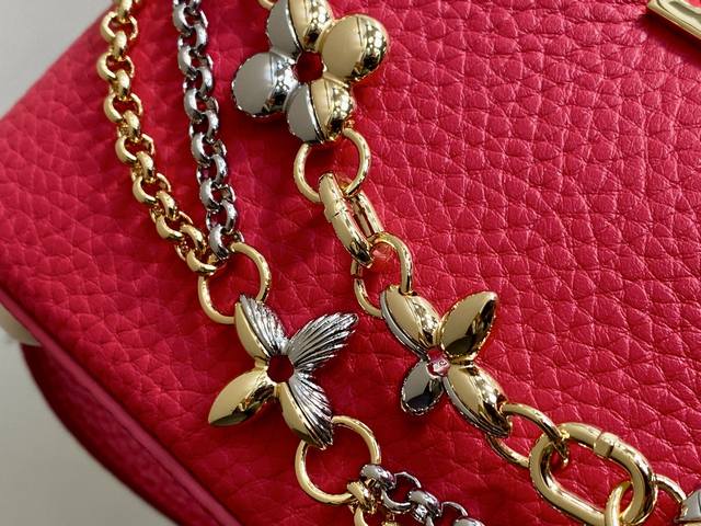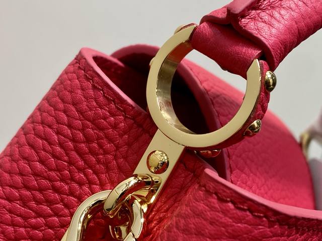 Original Quality M27035 Plum Red Full Leather Capucines Mini Chain Bag (Na Ying Style). This Capucines Mini handbag features a modern feel with an infinite chain inspired by jewelry. A sophisticated piece that can be worn day or night. Made of classic black Toluon leather. Hardware details include a double-galvanized finish, such as the signature LV initials, achieved with a Sunburst effect using Sorayyaju technology. It can be worn as a crossbody or shoulder bag using the detachable strap, or styled by carrying it by the top handle. 21 x 13.6 x 8 cm (Length x Height x Width)