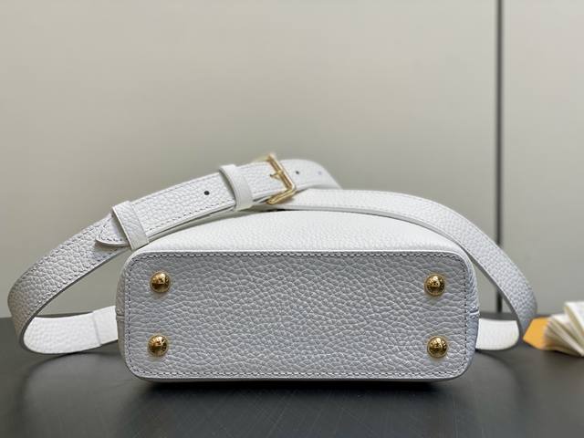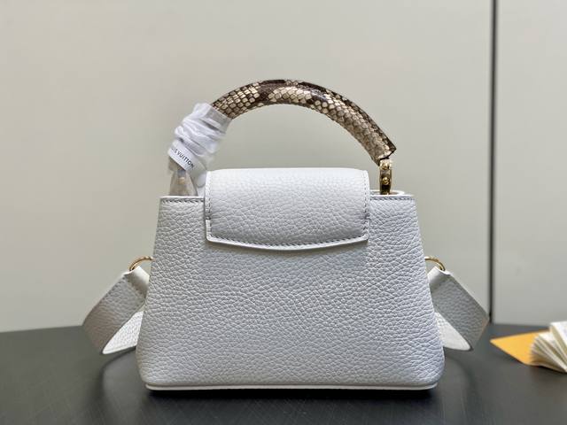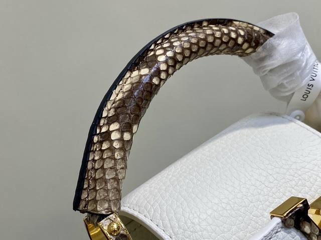 Original Quality M85515 White Snakeskin Capucines Mini Handbag (Na Ying Style) This mini handbag is crafted from Taurillon cowhide, with the handles and LV logo wrapped in luxurious python leather, infusing the iconic design with exotic flair. A detachable shoulder strap allows for comfortable shoulder or crossbody wear. 21.0 x 13.6 x 8.0 cm (Length x Height x Width)