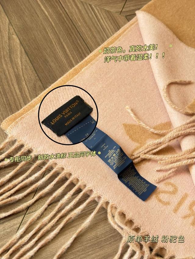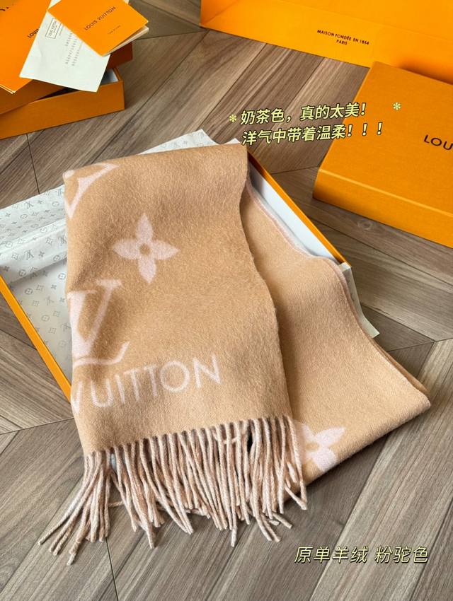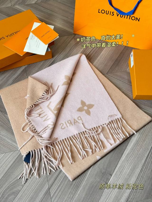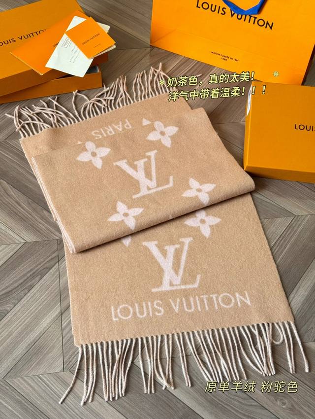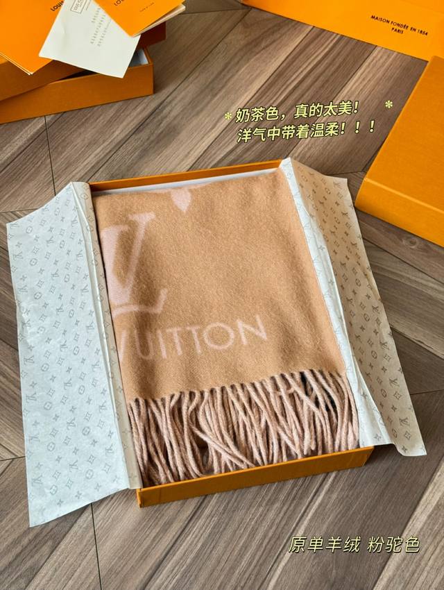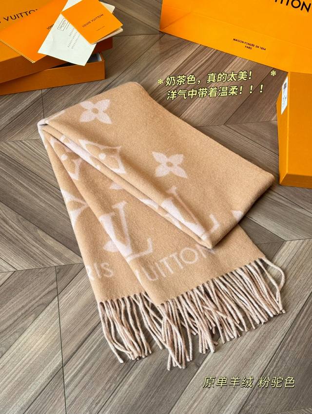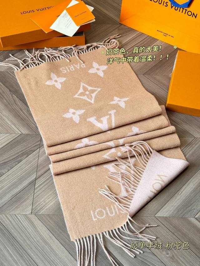 Original version of the Louis Vuitton Essential Double-Faced Cashmere Scarf in Pink Camel. This Lv Essential scarf focuses on key elements, featuring the Monogram pattern and Louis Vuitton logo to showcase the brand's heritage. Paired with soft fringe trims, it's a relaxed alternative to Reykjavik scarves. The King of Softness!! It's comfortable and warm, even if it's beautiful. Comfortable and warm, even if it's not beautiful. Size: 180 x 45 cm. Made from 100% cashmere.