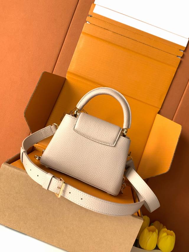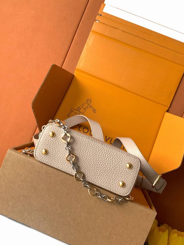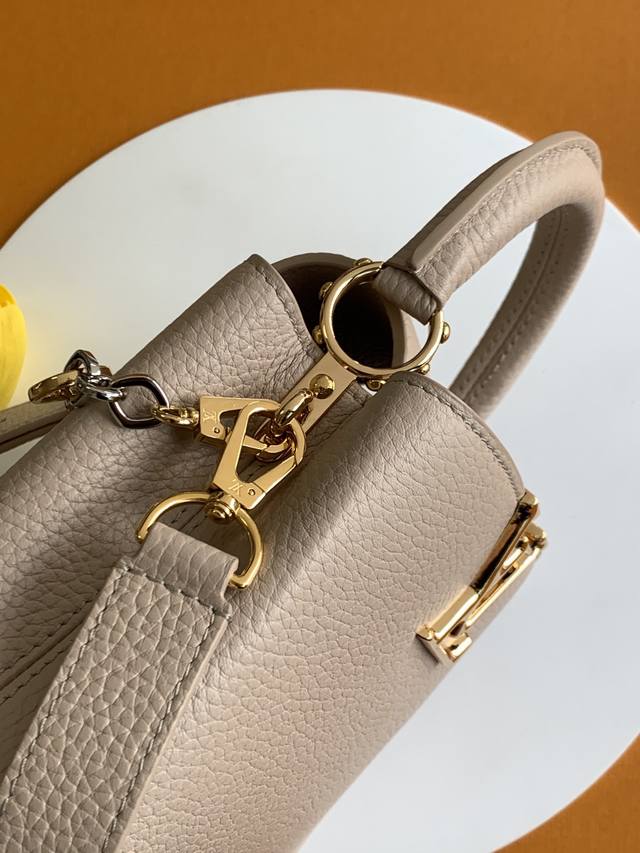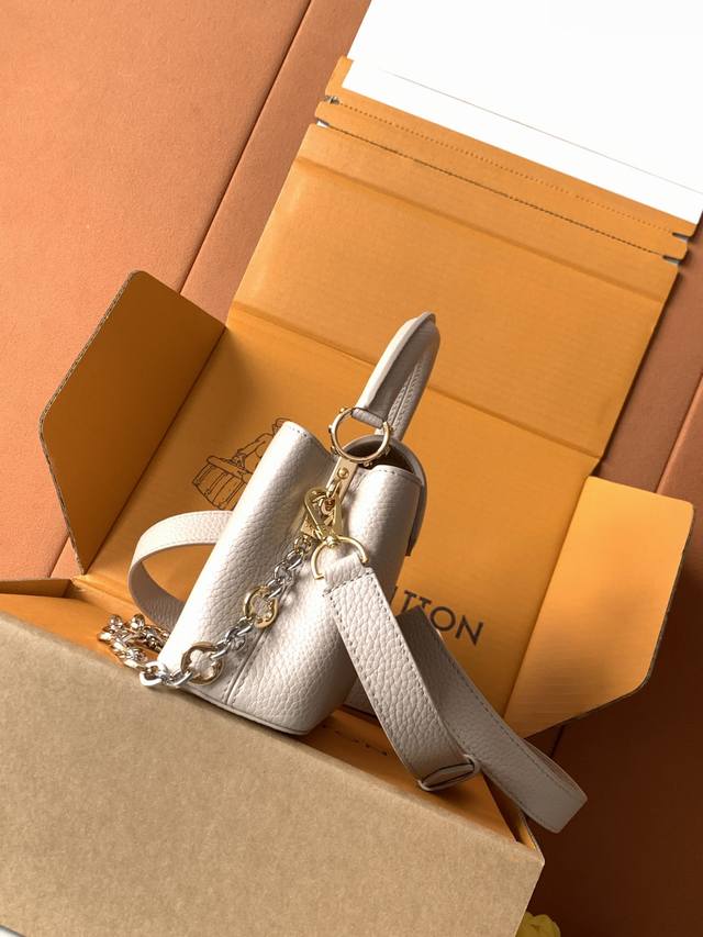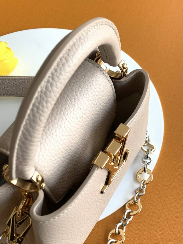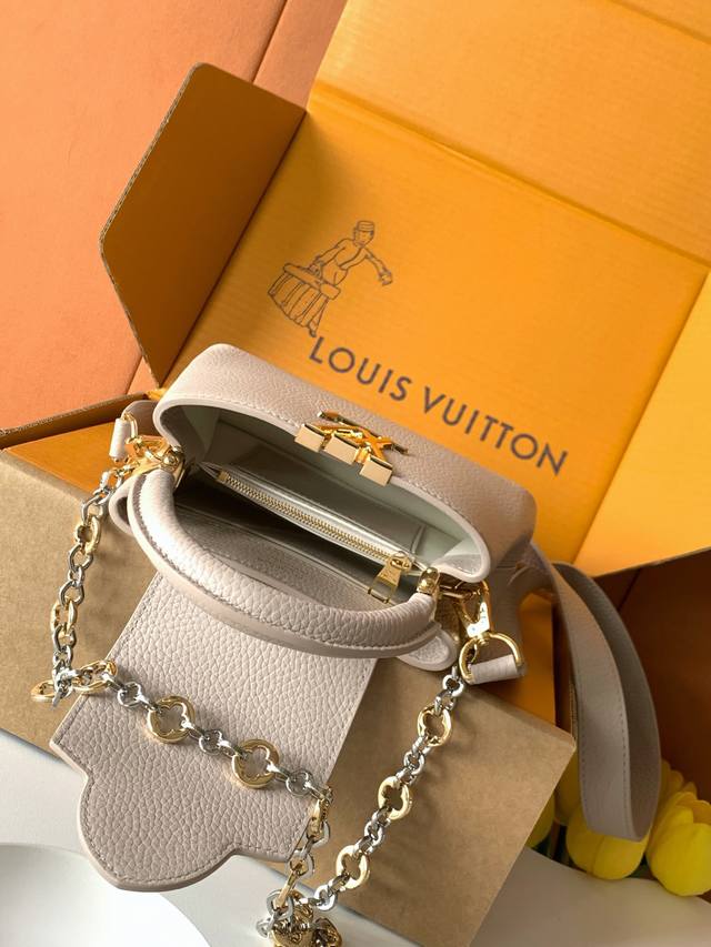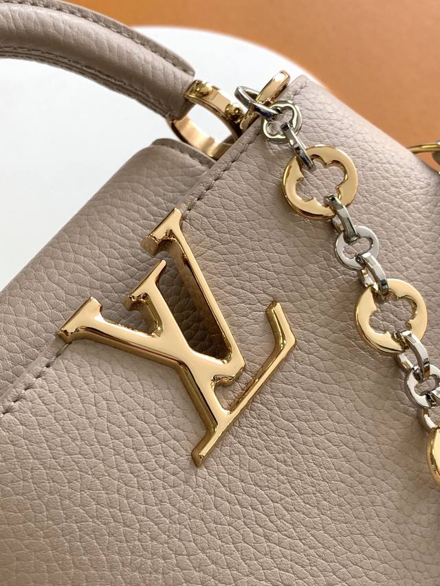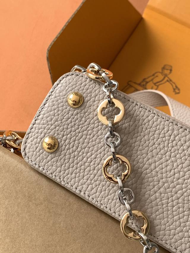 Premium All-Steel M12938 Gray Purple Gold This Capucines mini handbag, part of the Capucines Chain On You collection, is crafted from soft Taurillon imported cowhide leather, creating ample space for everyday essentials like a small wallet, keys, and lipstick. The jewelry-inspired double-plated chain incorporates Monogram floral details, complementing the rounded Lv lettering. The flap can be worn either inward or outward.