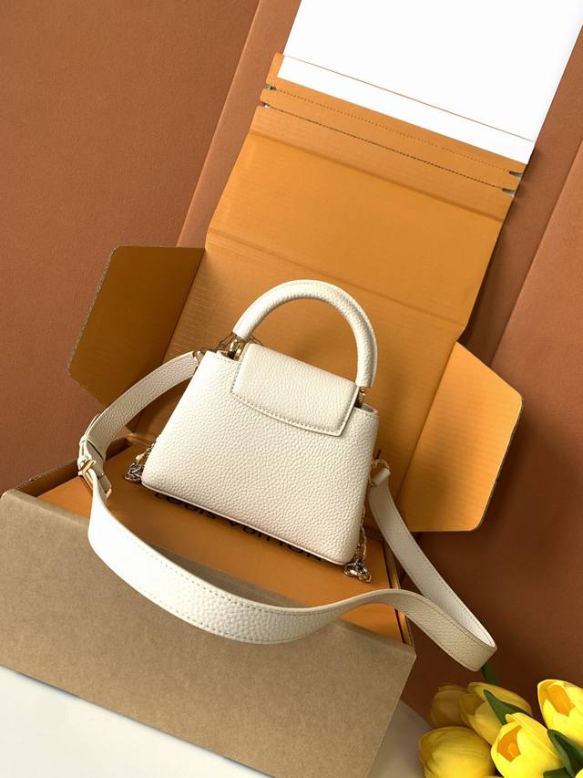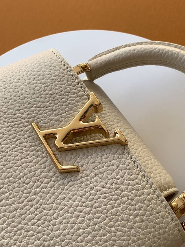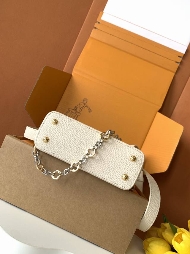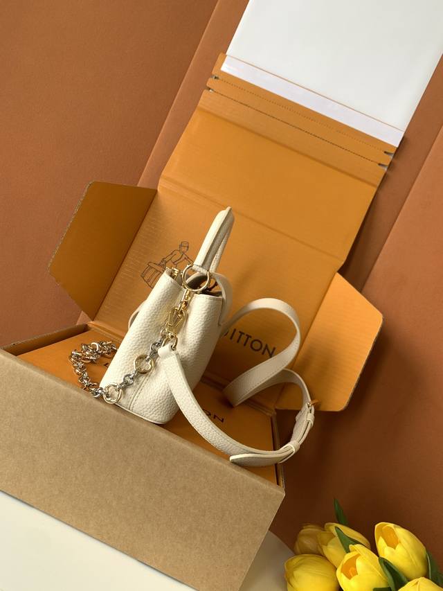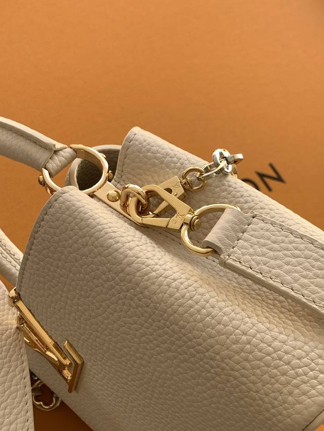 Premium All-Steel M12938 Pearl White Gold M12938 Black Gold This Capucines mini handbag is part of the Capucines Chain On You collection. Crafted from soft Taurillon imported cowhide leather, it offers ample storage for a compact wallet, keys, lipstick, and other daily essentials. The jewelry-inspired double-plated chain features Monogram floral details, complementing the rounded Lv lettering. The flap can be worn either inward or outward.