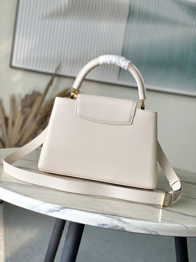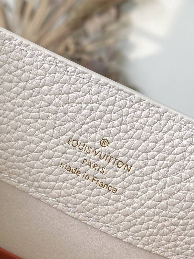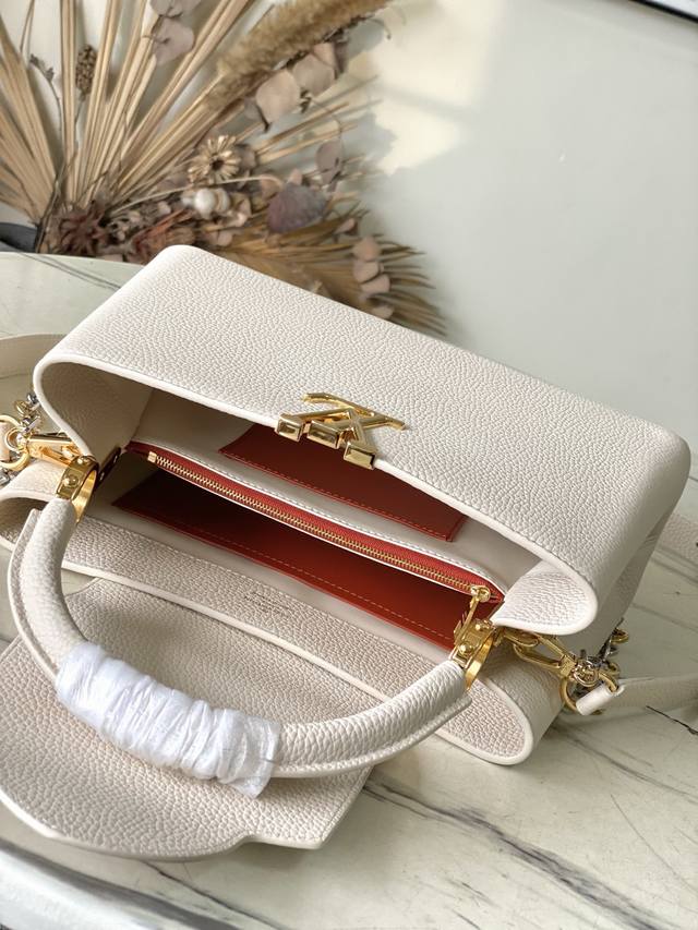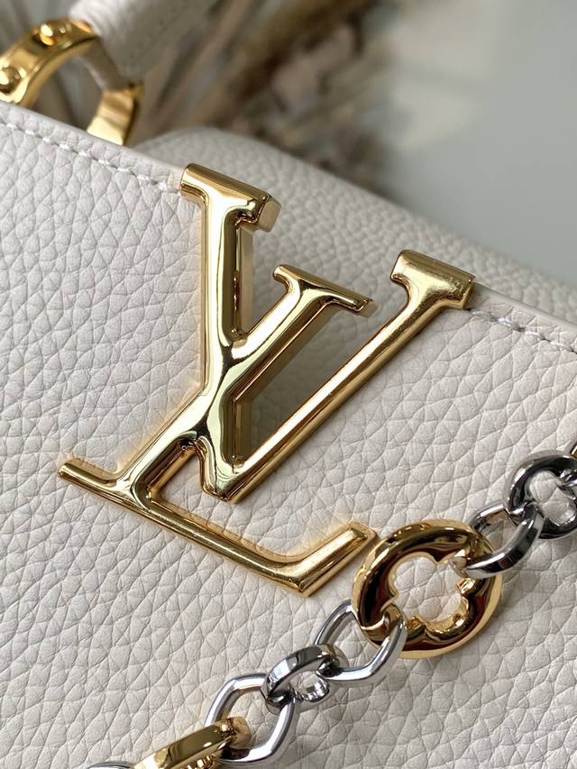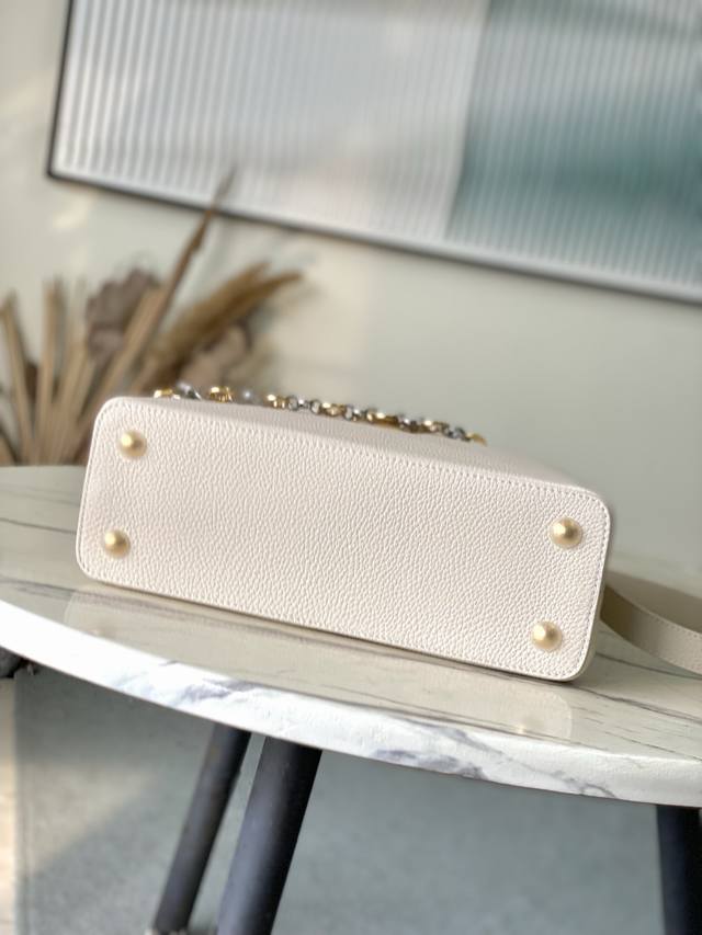 Premium Genuine Leather M12935 Cream Medium. This Capucines medium handbag is from the Chain On You collection, crafted from Taurillon cowhide, showcasing the brand's ingenuity and exceptional craftsmanship. The jewelry-inspired double-plated chain is embellished with Monogram flowers, while the rounded LV lettering and hardware add a refined touch. Whether carried crossbody, by hand, or on the shoulder, it exudes elegance. Dimensions: 31.5