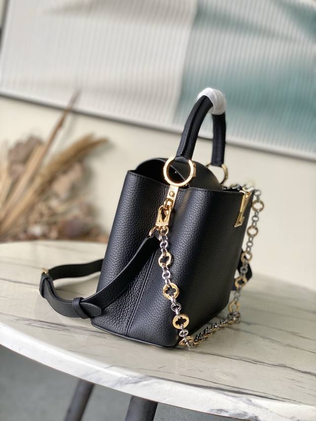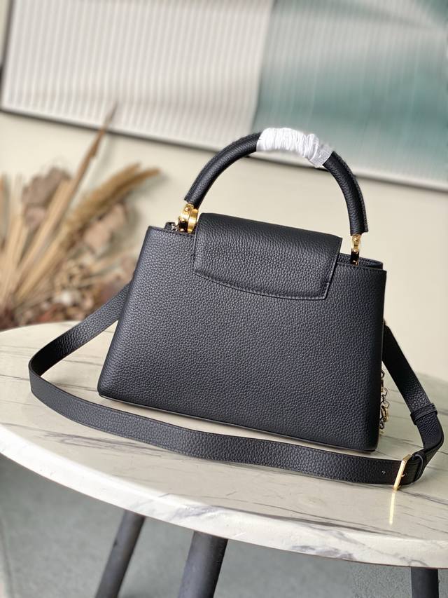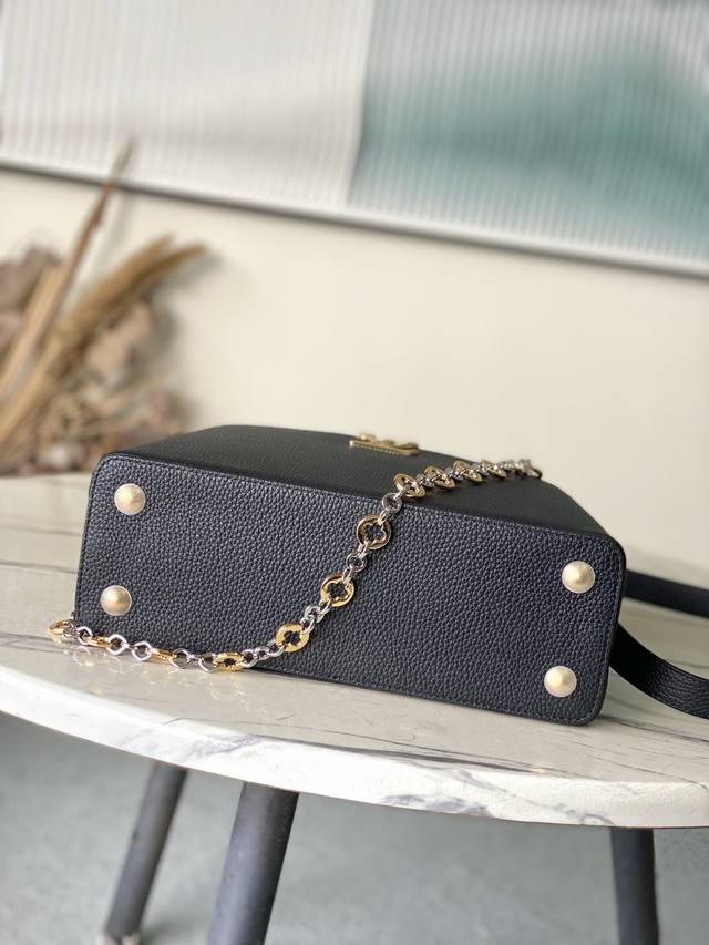 Premium Genuine Leather M12936 Black Medium This medium Capucines handbag is from the Chain On You collection, crafted from Taurillon cowhide leather and embodying the brand's ingenuity and exquisite craftsmanship. The jewelry-inspired double-plated chain is embellished with Monogram flowers, while the rounded LV lettering and hardware add a refined touch. Whether carried crossbody, by hand, or on the shoulder, it exudes elegance. Dimensions: 31.5