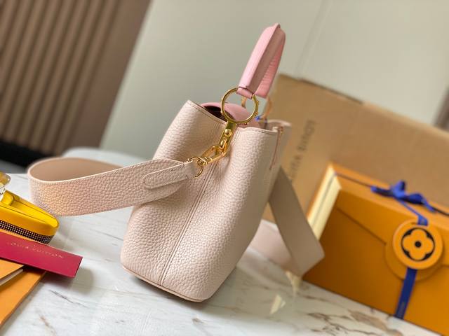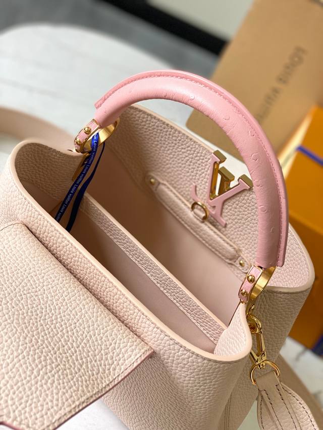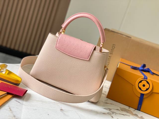 Premium Genuine Leather N81409 Pink with Ostrich Gold Buckle Ddd This Capucines BB handbag features a luxurious color on the Taurillon leather body, with ostrich leather trim on the flap and top handle, complementing the supple shell of the LV logo and showcasing the aesthetic vision of Louis Vuitton's master colorist. DDD Detailed Features Ddd 27 X 18 X 9 cm Length X Height X Width DDD