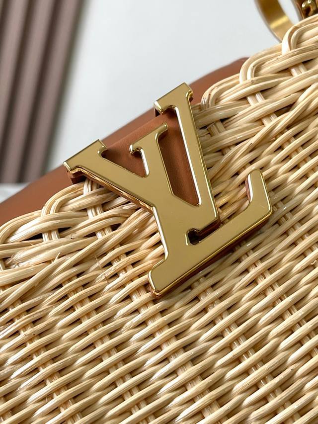 The Capucines Bb Hi handbag features a unique rattan woven design, a nod to the Louis Vuitton picnic box design introduced in 1892.