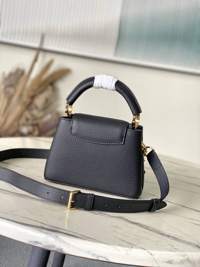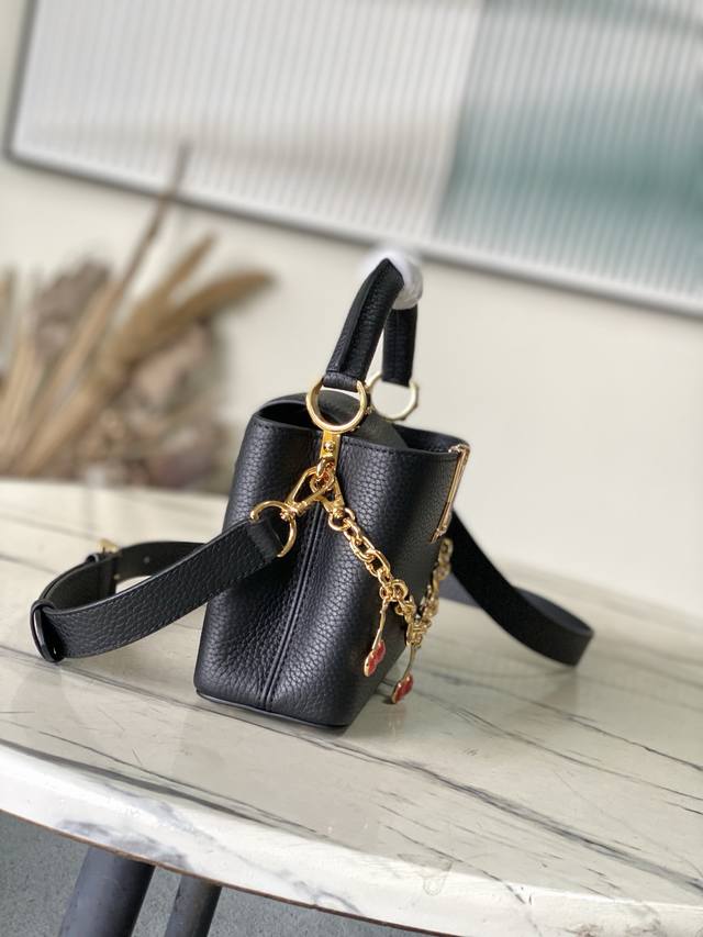 Premium Original Leather M13714 Mini Capucines Bag, from the Louis Vuitton x Takashi Murakami Replica Collection, showcases the brand's exquisite craftsmanship with its dynamic style. Shiny hardware and enameled Lv initials accentuate the Taurillon leather body. A Monogram flower rests on the detachable chain, while vibrant cherry embellishments add a fresh, seasonal touch. Dimensions: 21