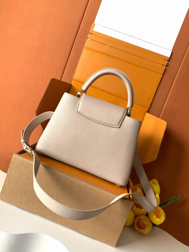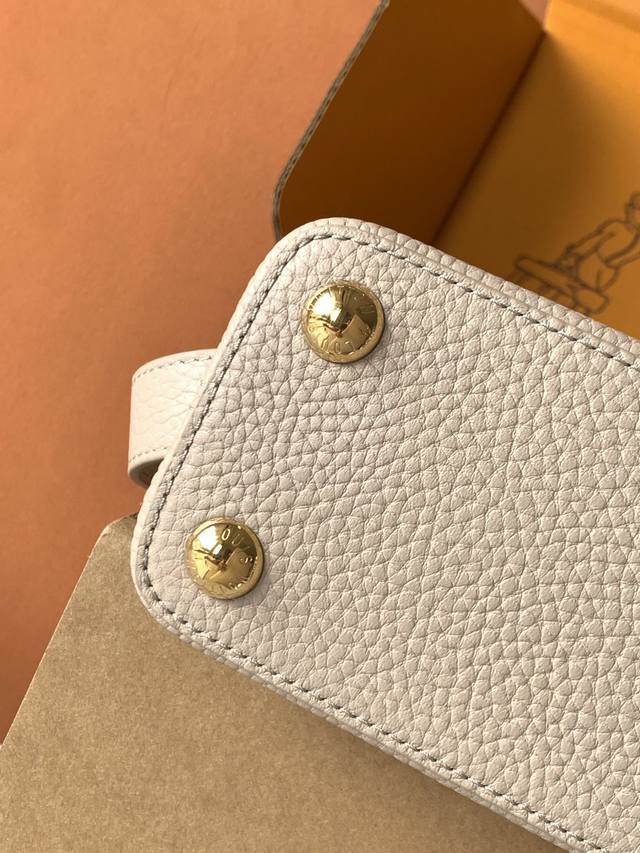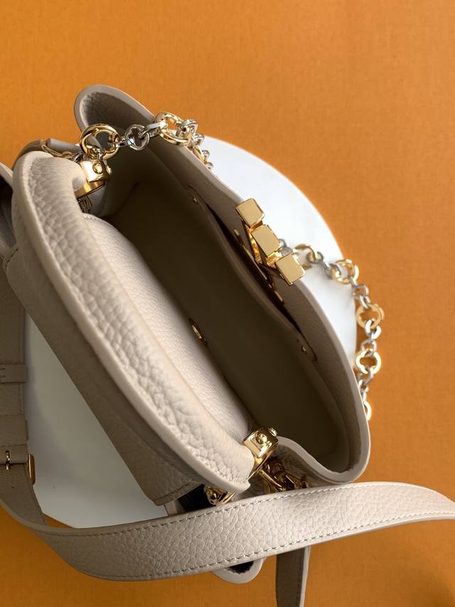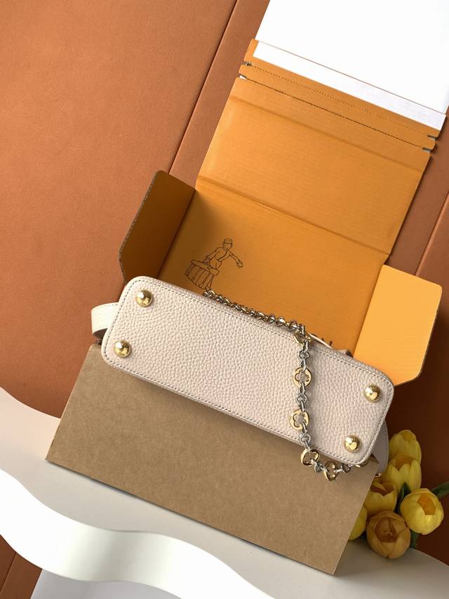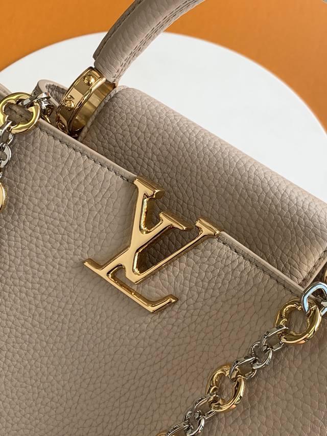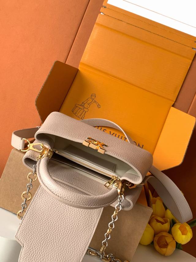 Special-grade all-steel M12936 gray and purple gold. This Capucines mini handbag is from the Capucines Chain On You collection. Crafted from soft imported Taurillon cowhide leather, it offers ample space for everyday essentials like a short wallet, keys, and lipstick. The jewelry-style double-plated chain incorporates Monogram floral details, complementing the rounded Lv lettering. The flap can be folded in or out.
