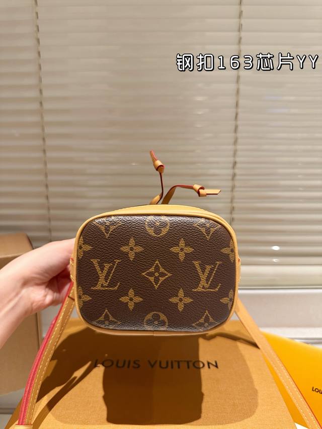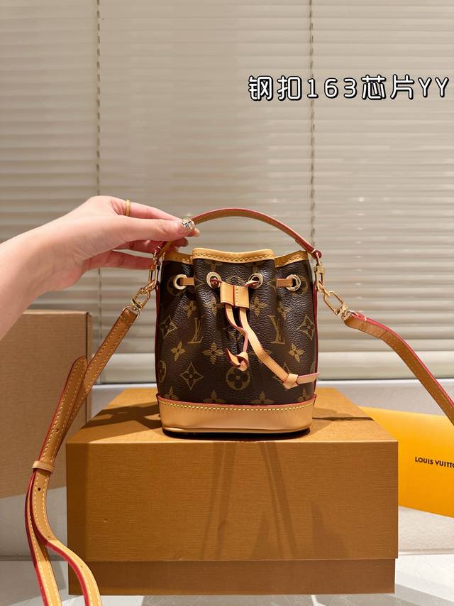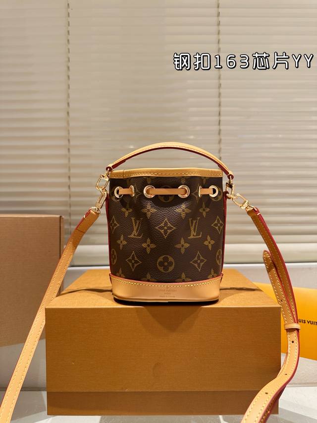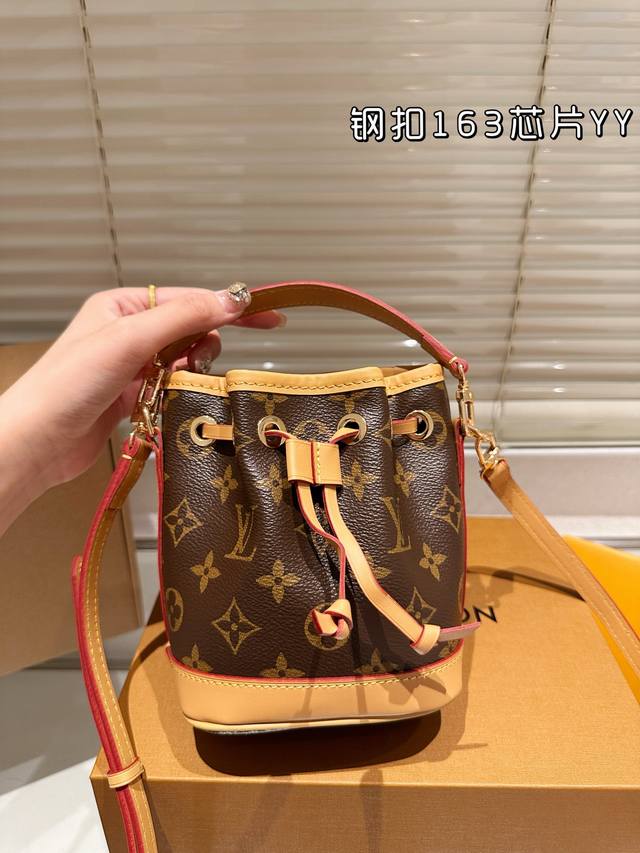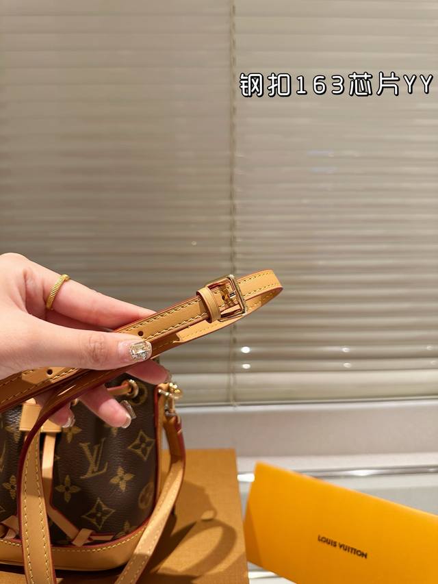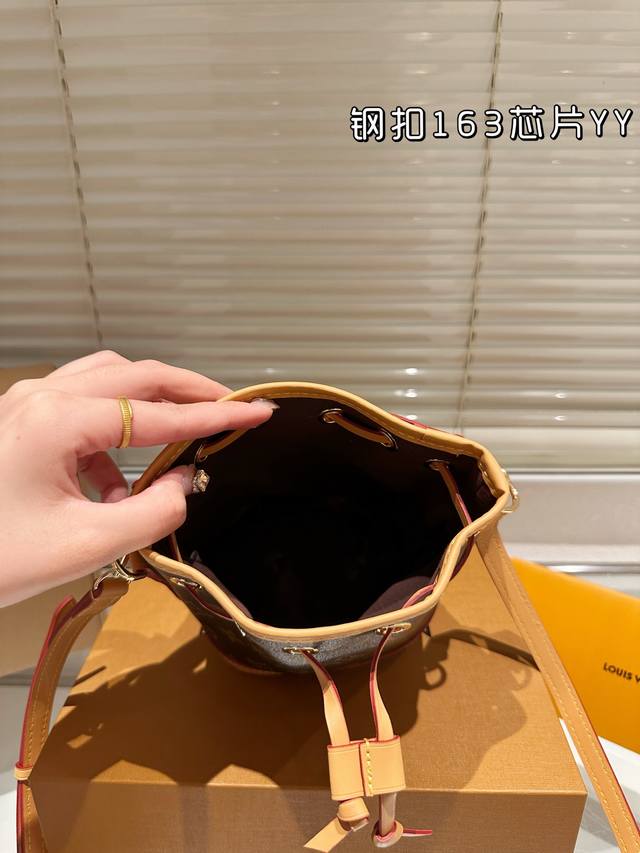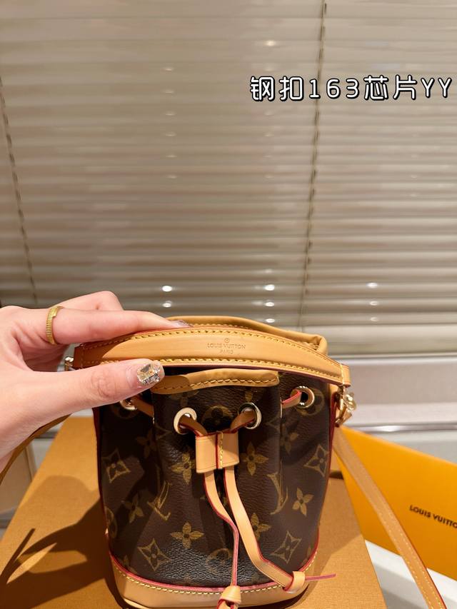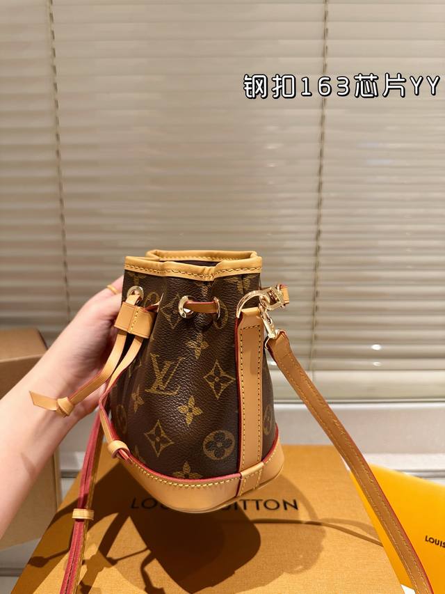 . Does it look familiar? It looks a bit like a smaller Noe Bb. It's so popular since it launched on April 1st. It's popular for a reason, haha! It looks mini, but it can hold a lot more than you'd expect. It can hold a phone, keys, AA, lipstick, tissues, and more. It's practical, easy to carry, and a bit playful. It's the king of small bags. The overall shape is stiffer and more three-dimensional than the old model. And the bottom of the new model is so beautiful. The bottom is made of old flower material. It can be carried by hand, the handle is detachable, and the shoulder strap is adjustable and detachable, so you can wear it in many ways.