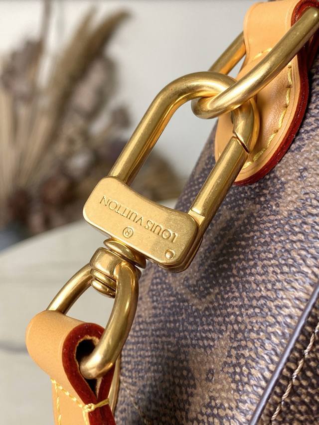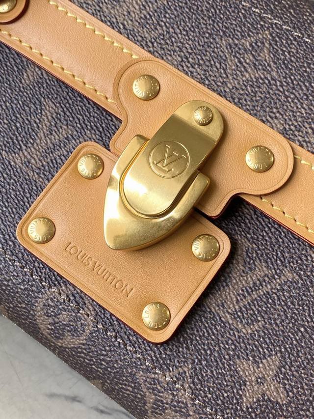 Steel hardware, premium original M11535. This Soul Trunk bag is crafted from Monogram Dust canvas, with the distressed texture of the leather and hardware accentuating the faded Monogram floral and LV logo. Reinforced corners, delicate stitching, leather details, and the Tumbler lock clasp continue the signature elements that Pharrel Williams has infused into the Soul Trunk collection. Dimensions: 19