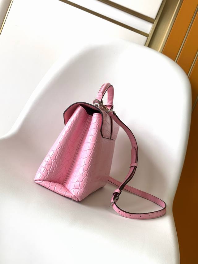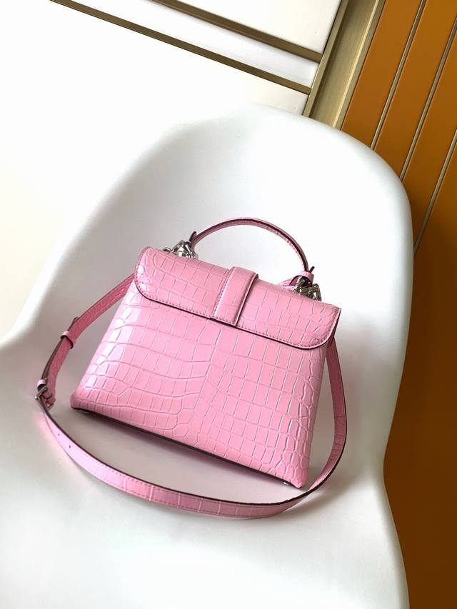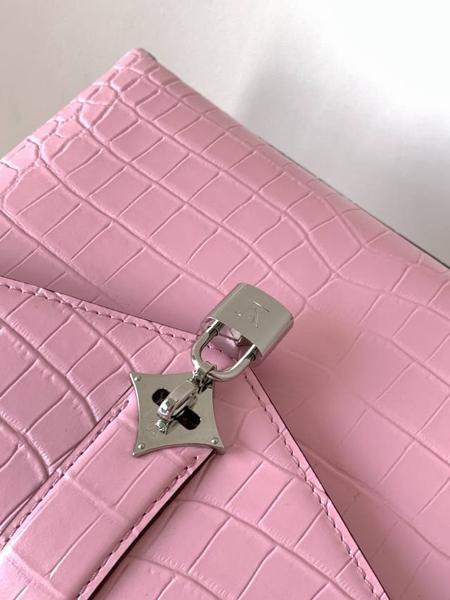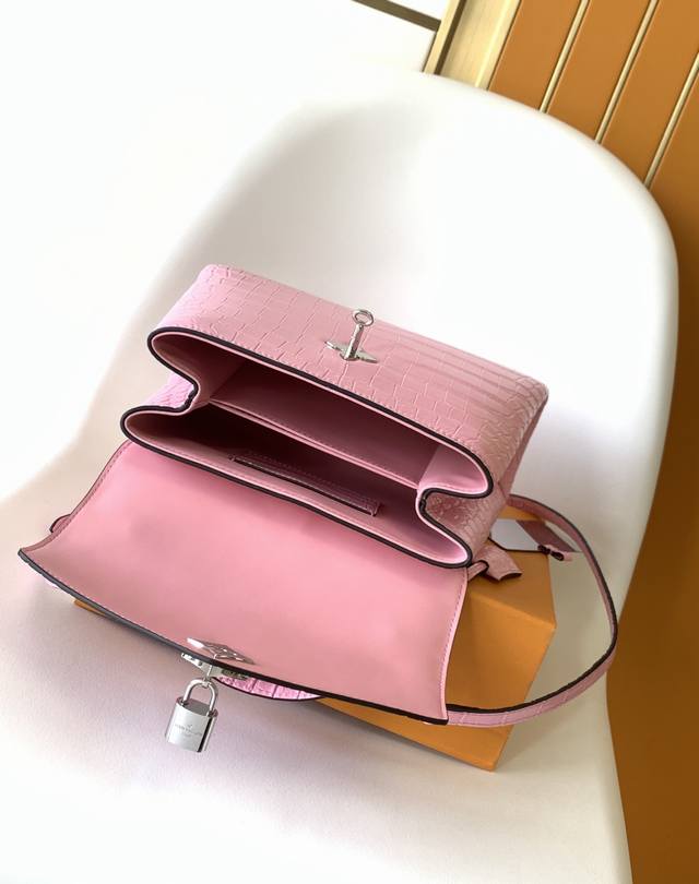 N98928 Crocodile Red N80432 Crocodile Pink N99017 Crocodile Gray N84714 Himalaya N86012 Black with Crocodile Rose Des Vents Small Handbag crafted from smooth and grained calfskin, elegantly outlined with a gleaming gold Lv padlock. The clever top handle and detachable, adjustable shoulder strap create a stylish and versatile carry for everyday travel, whether worn by the elbow or across the body.