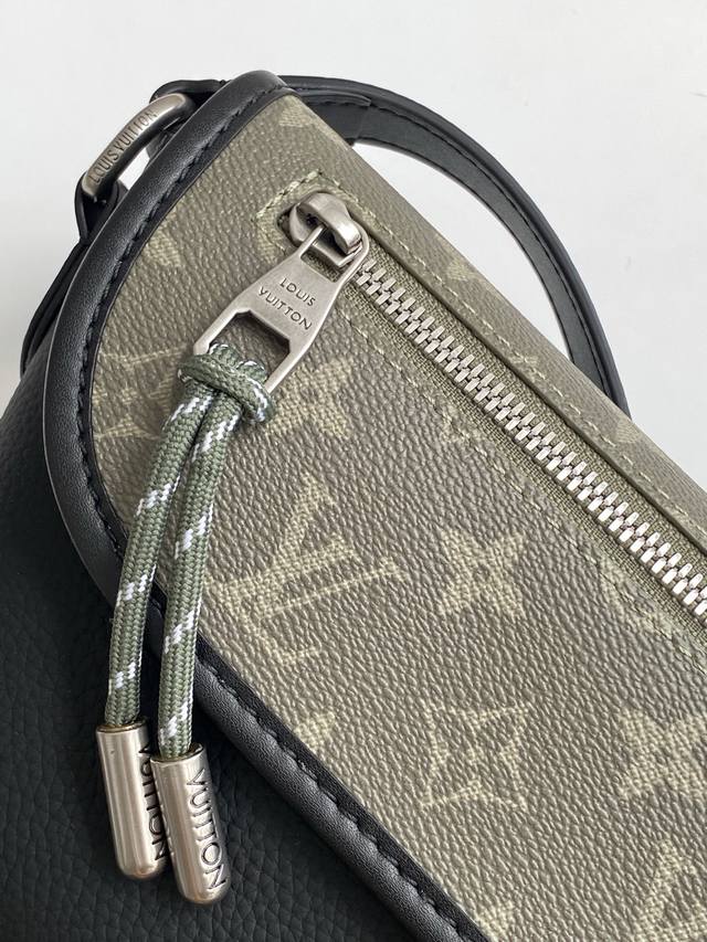 The premium original M12618 Pulse mini bag features a masterful blend of traditional leather and Monogram canvas, striking a balance between comfort and functionality. The Lv logo accentuates the brand's signature style, while the cord zipper pull gleams metallically. The flap features a patch pocket inside and outside, a zippered pocket inside, and an adjustable shoulder strap with a side loop. Dimensions: 22.5 x 16 x 5 cm