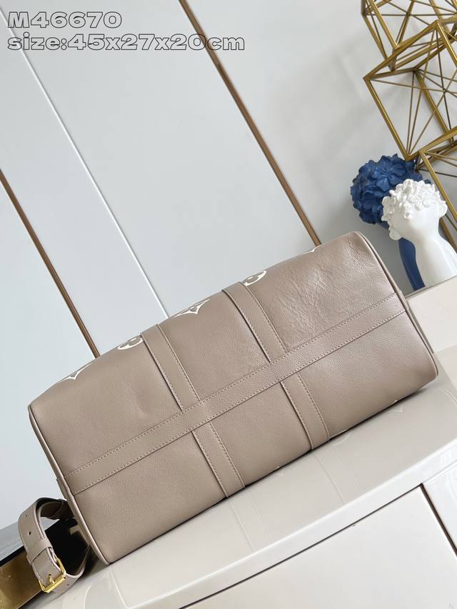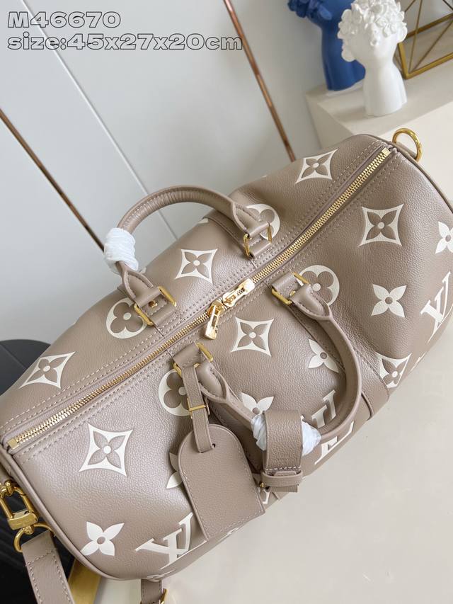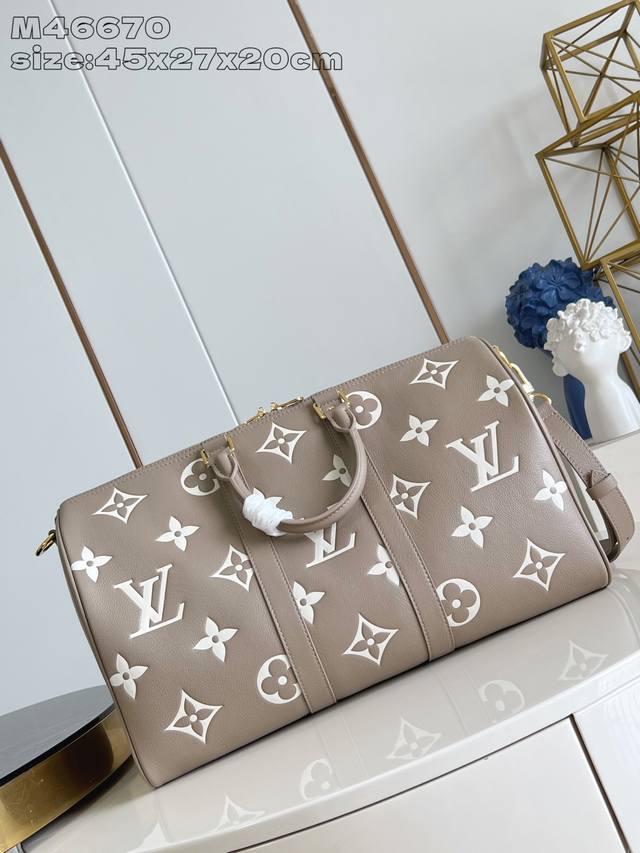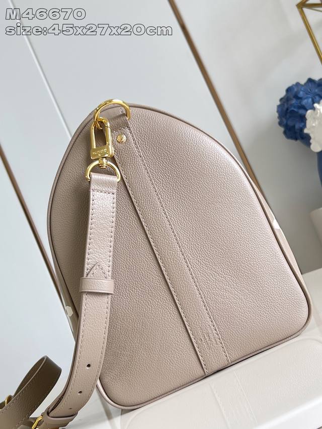 This top-of-the-line original M46670 gray silk-screened Keepall Bandouli