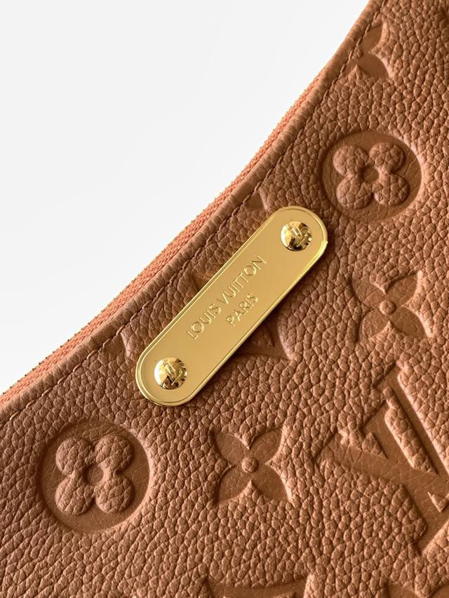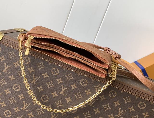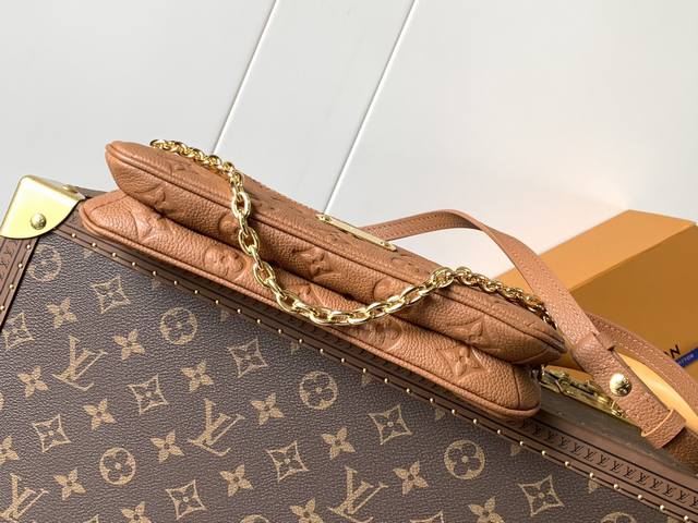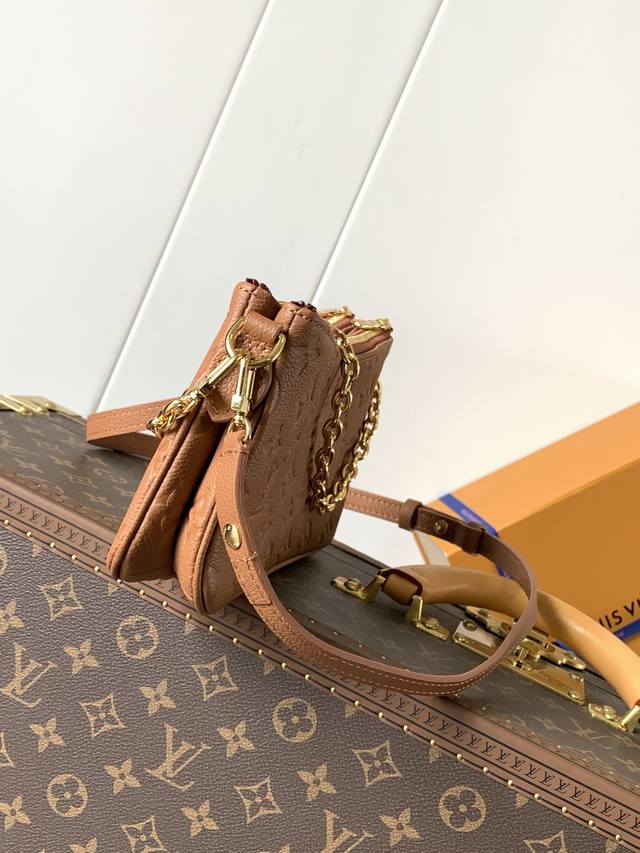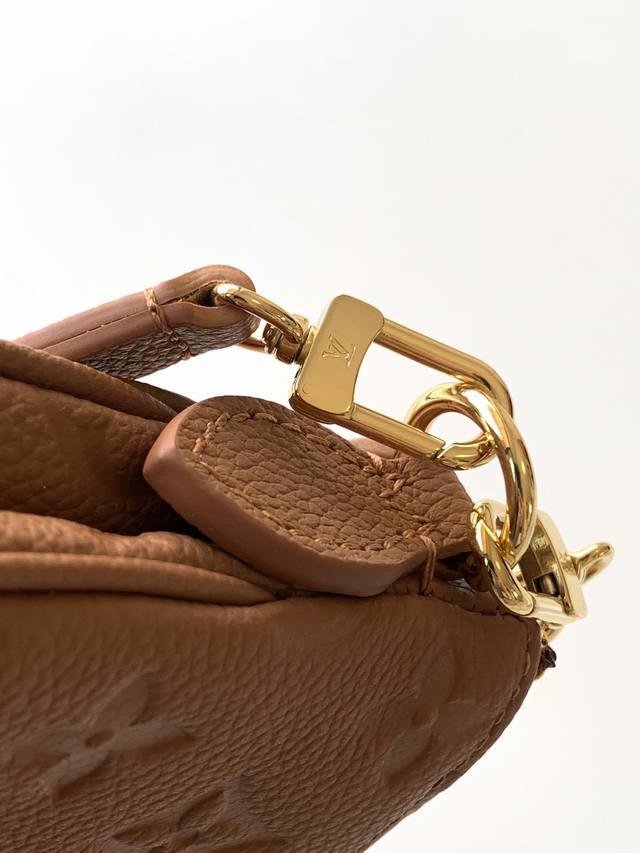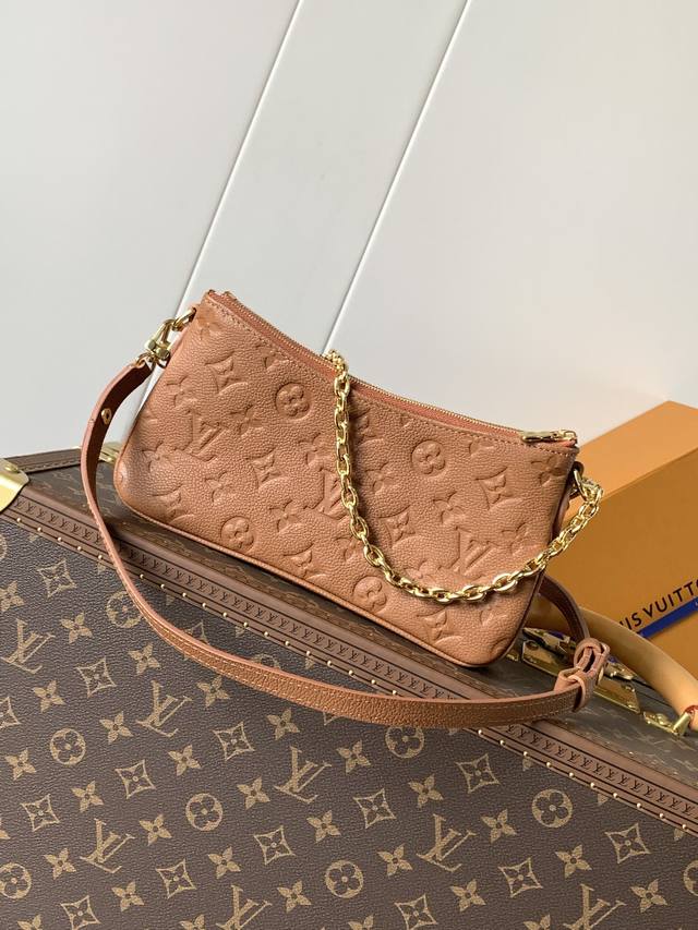 The Liv Pochette in Monogram Empreinte leather fits snugly on the arm. It comes with a detachable gold chain and a detachable, adjustable double strap made from Louis Vuitton's iconic natural cowhide. The secure double zipper closure and engraved gold plaque complete this stylish piece. Size: 24X13X6.5Cm