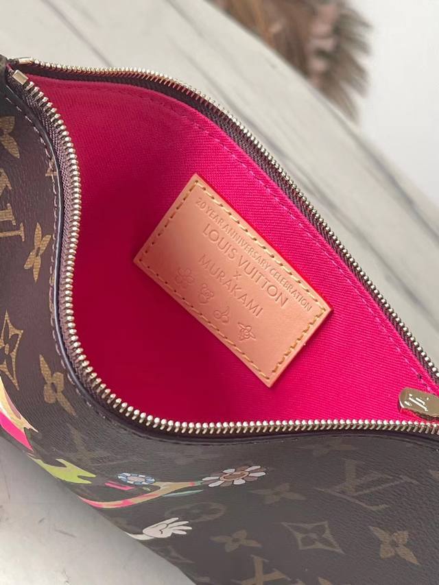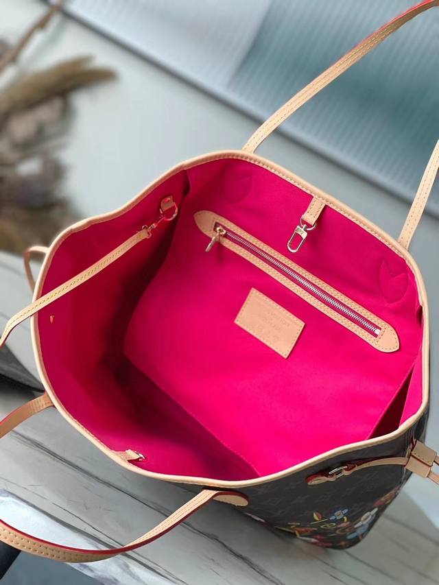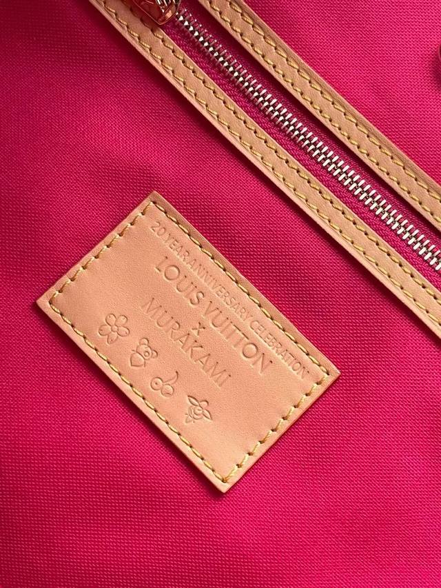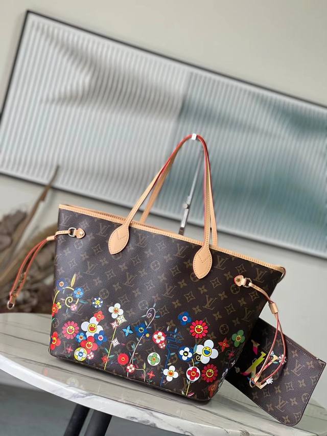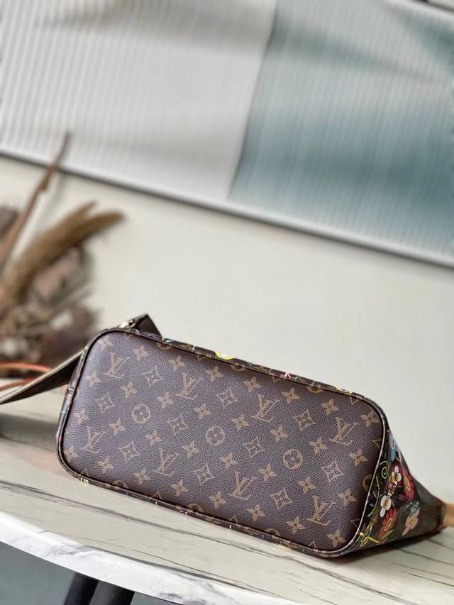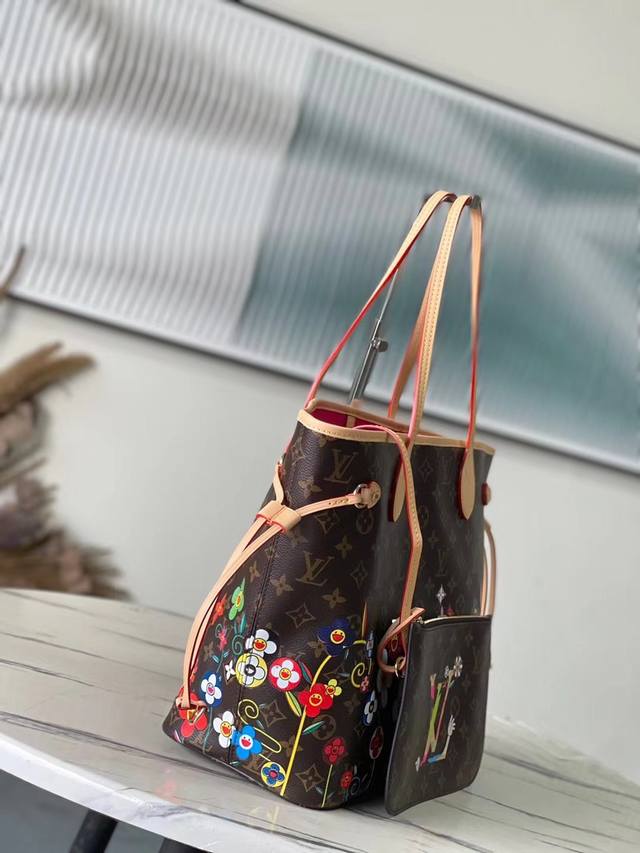 Top-grade original M13271 This Neverfull medium handbag, from the Louis Vuitton x Takashi Murakami re-edition collection, features Monogram canvas for a spacious silhouette, while the vibrant Monogram floral motif embodies the artist's "superflat" aesthetic. Cowhide leather outlines the top edge, handles, and side straps, while the fabric lining incorporates colorful stripes. A zippered interior pocket and a removable storage pouch complete the functional design. Dimensions: 31