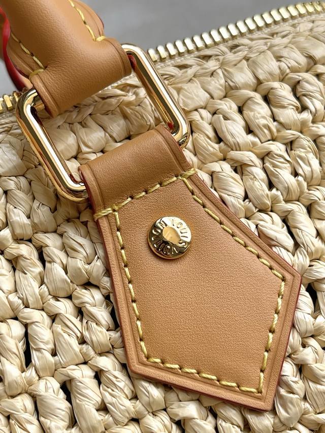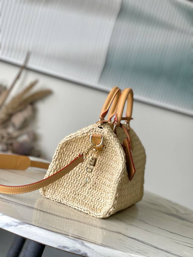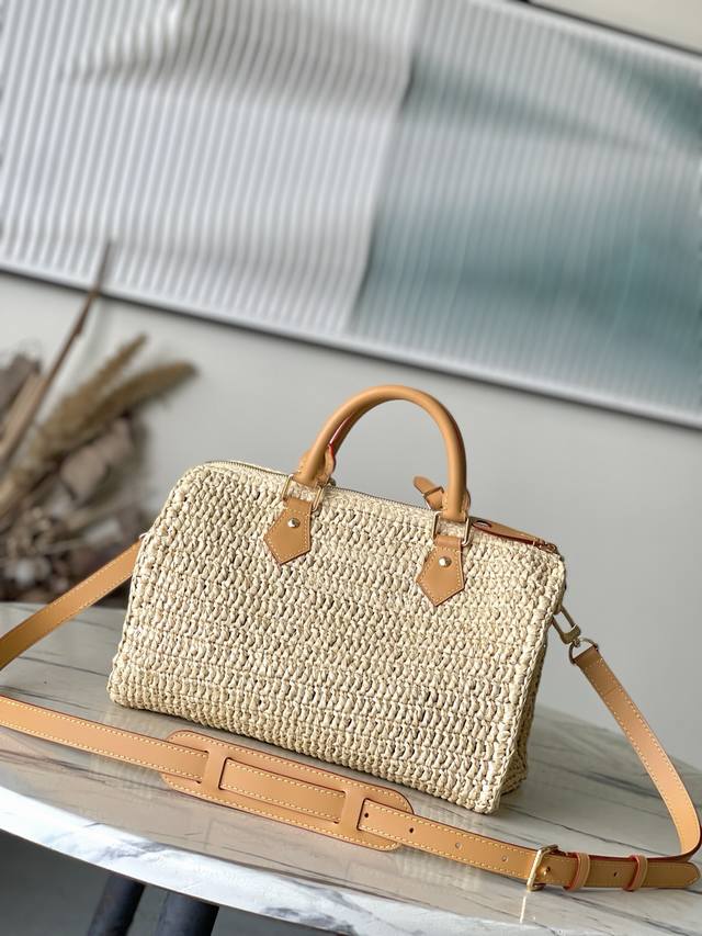 Top-grade original M14457 This Speedy 30 Bandouliere handbag is crafted from raffia, each piece imbued with a unique style through meticulous craftsmanship, while distressed cowhide leather adds a vintage touch. Lv initials are embroidered on the front, while a top handle and a detachable, adjustable shoulder strap allow for flexible carrying. Dimensions: 34