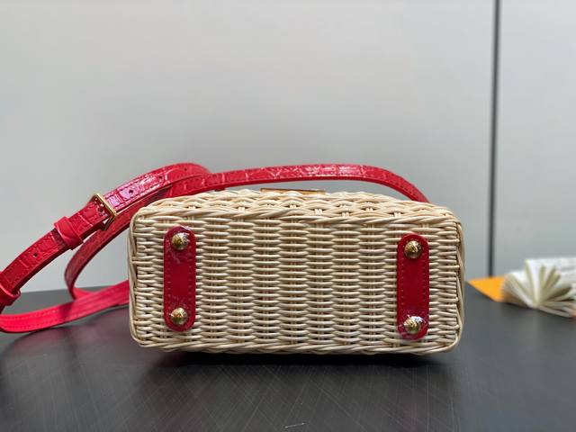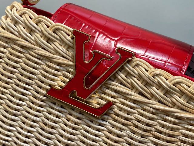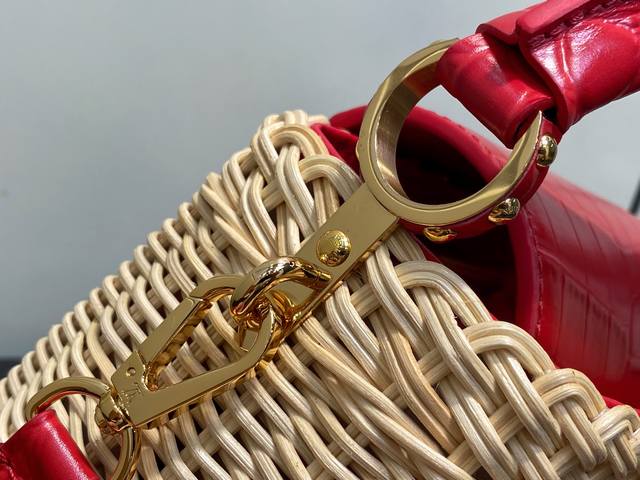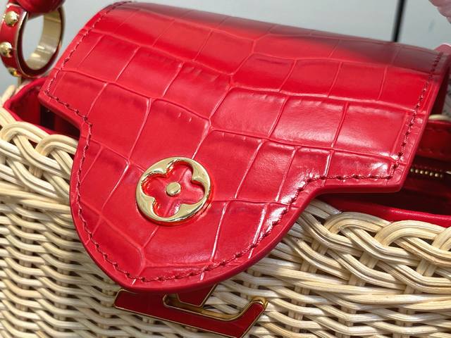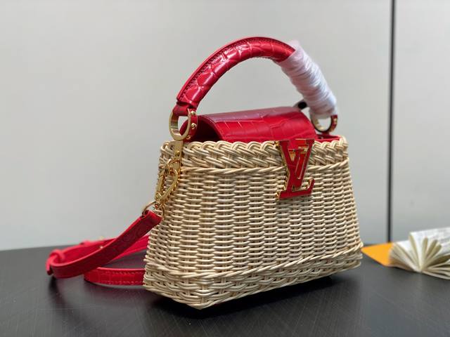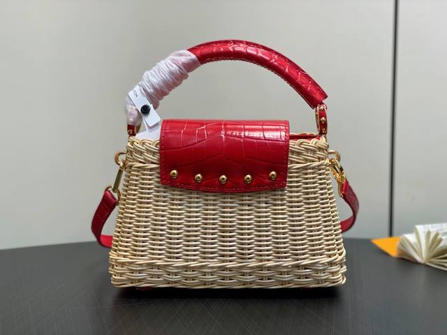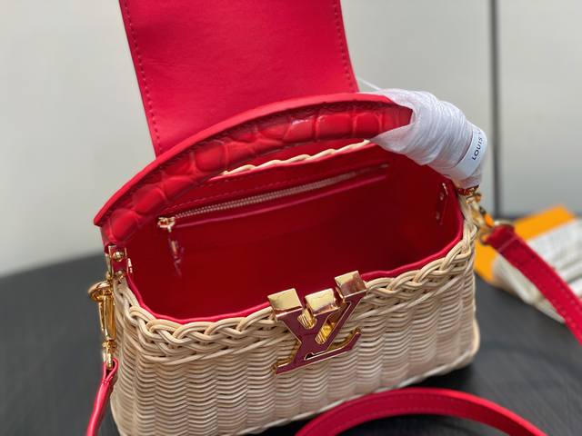 Top-grade original M88126 Red Woven Crocodile Print Cap Na Ying Style Capucines Mini Handbag. This Capucines Mini HL handbag harks back to the brand's Picnic trunk, launched in 1892, and embodies holiday chic. The rattan body requires several days of meticulous weaving, and the Lv monogram and printed lining add a classic touch. The flap can be opened inside or outside, providing ample space for everyday items. Dimensions: 21 x 13.6 x 8 cm
