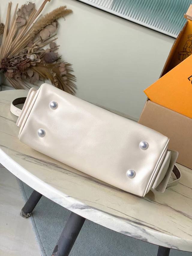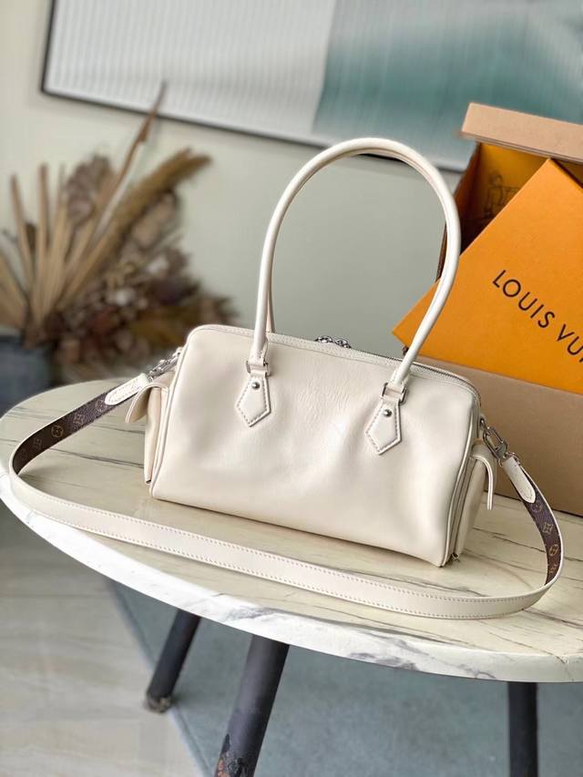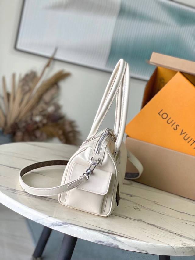 Top-grain leather, original M12965. This Speedy Cargo bag from the Lvvbe collection reimagines a classic 1930s design with an avant-garde touch. Its lustrous lambskin body features a Monogram address plaque, a nod to the brand's rich trunk-making heritage. Ample storage for everyday essentials, and a detachable leather shoulder strap allows for versatile carrying options. Dimensions: 28