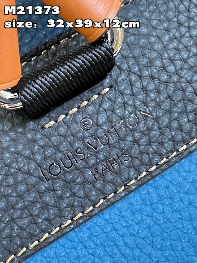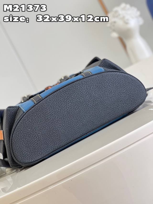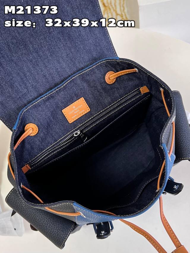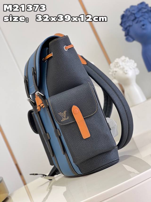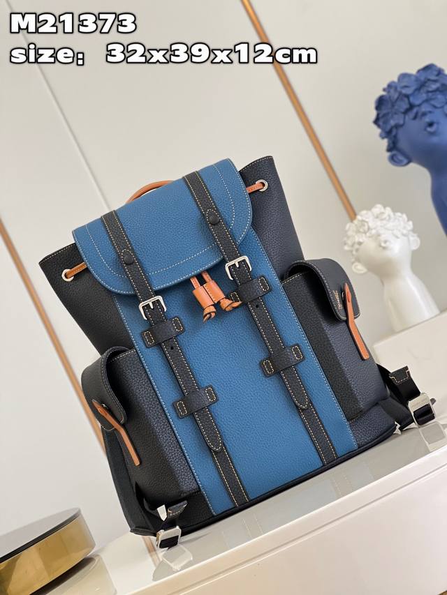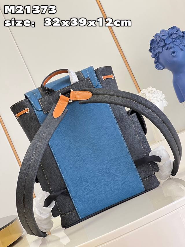 Top-quality original, in-house photo. M21373. This Christopher Small Backpack draws inspiration from the denim boom of the 1970s, featuring Taurillon leather dyed in varying shades of denim. Cowhide leather creates striking details. Stitching throughout, including the Lv monogram on the side pockets, adds elegant contrast. Ample space makes it an ideal choice for everyday travel. Dimensions: 32 x 39 x 12 cm (Length x Height x Width) (