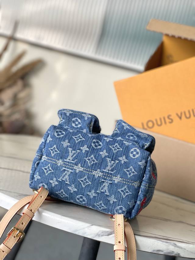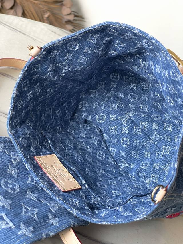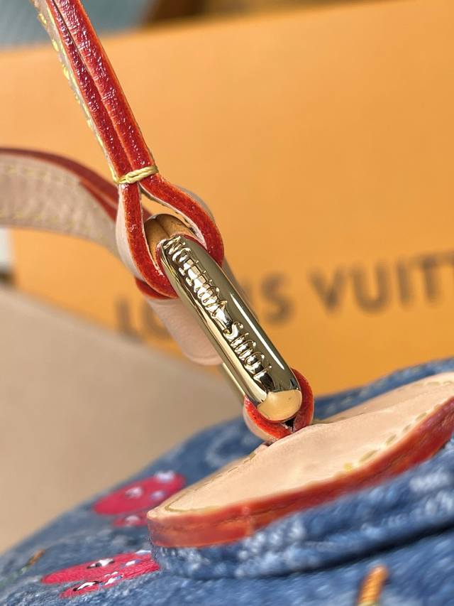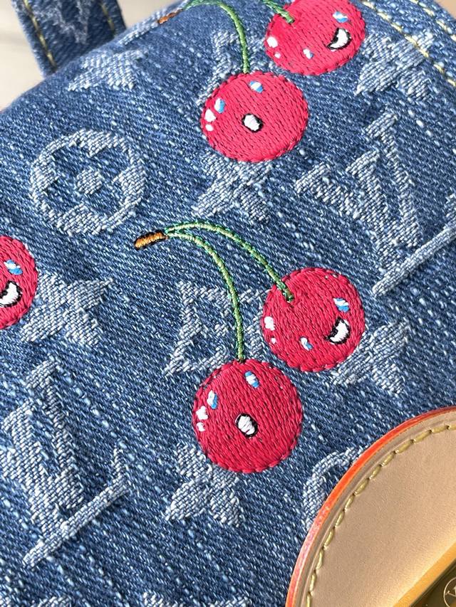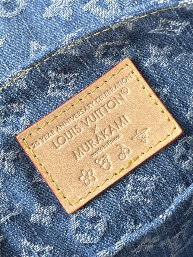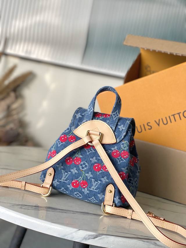 Top-quality original M13679 This Venice backpack, from the Louis Vuitton x Takashi Murakami retro collection, features Monogram denim embroidered with unique cherry patterns, playfully capturing the vibrant colors of the Japanese artist's brushstrokes. Fine leather outlines the slender shoulder strap, while a gleaming buckle illuminates the flap and exterior pockets. Dimensions: 24