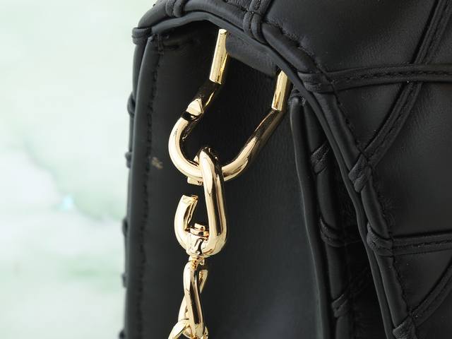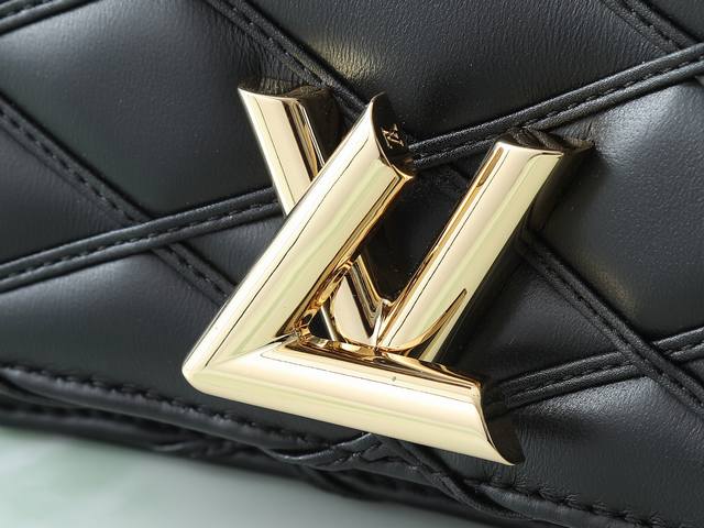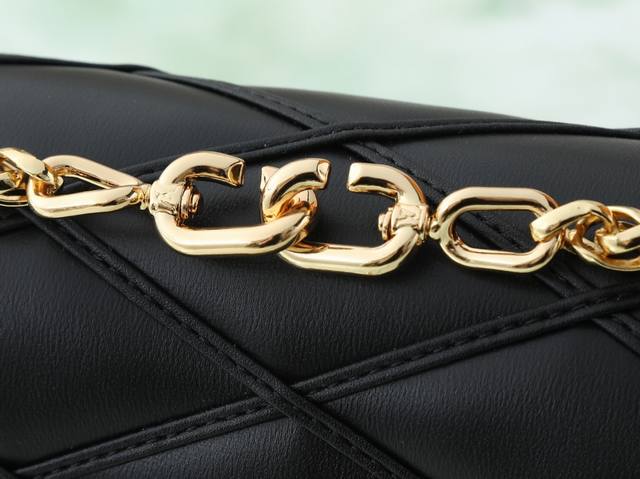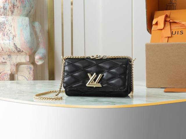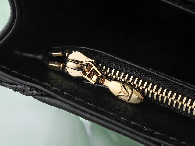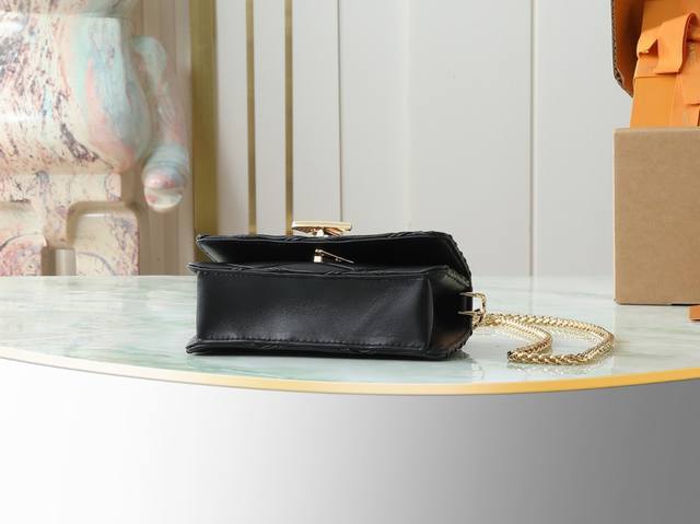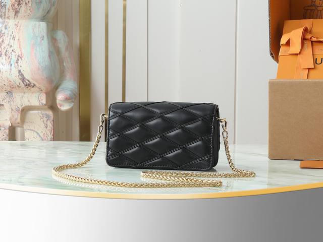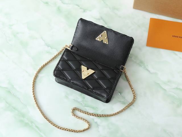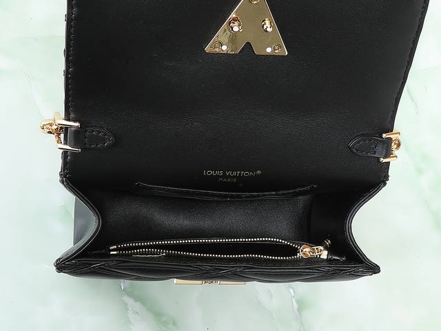 Top-quality original, original, and real-life photos of the Wallet On Chain Go-14 handbag in black, all-leather, diamond-patterned chain. The Wallet On Chain Go-14 handbag features luxurious quilted lambskin leather, continuing the brand's signature style. Its LV twist lock accentuates the look, making it a perfect daytime and nighttime accessory. The removable, round, smooth chain allows for versatile styling and can also be used as a clutch. 12 x 5 x 20 cm.