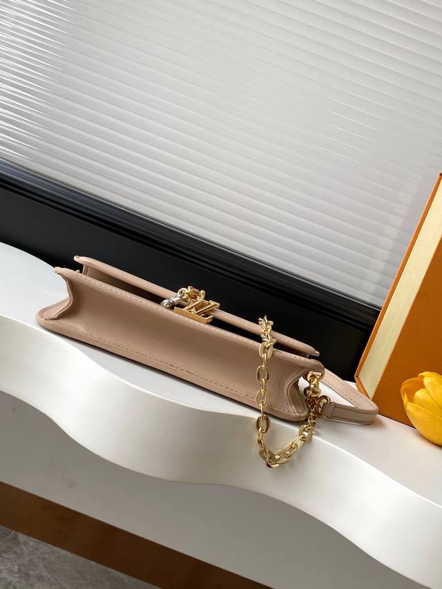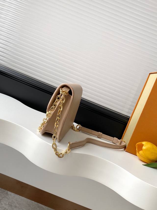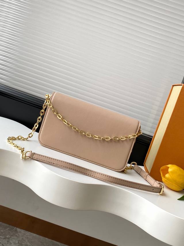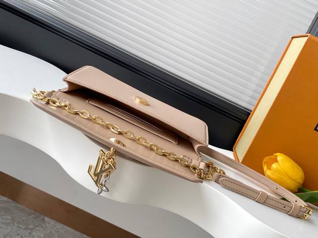 . M14564 Black, M14548 Watermelon Red, M14581 Apricot, and M14547 Light Blue. This Wallet On Chain handbag from Louis Vuitton's LV Bloom collection is crafted from cowhide leather in a stylish yet practical silhouette. It's embellished with embellishments inspired by the brand's iconic Monogram pattern. It has ample space for a smartphone, and contrasting metal hardware adds an elegant touch.