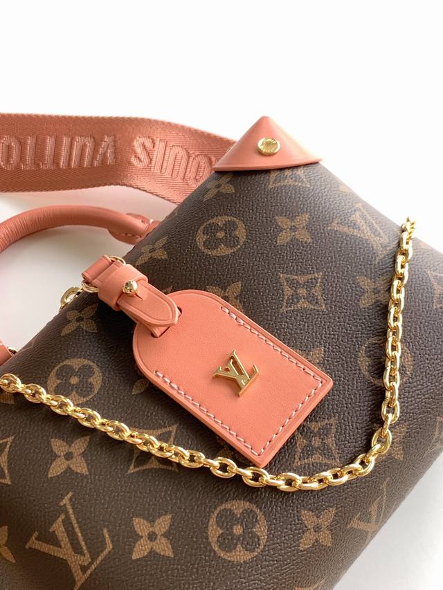 Top-tier original M45531 peach, M45571 black. This black petite Malle Souple handbag is crafted from Monogram canvas, incorporating studded leather trim and a leather nameplate, subtly showcasing the bag's trunk-making heritage. It features a nautical-style chain, Louis Vuitton Malletier embroidery, and a detachable wide shoulder strap. Dimensions: 20.0 x 14.0 x 7.5 cm.