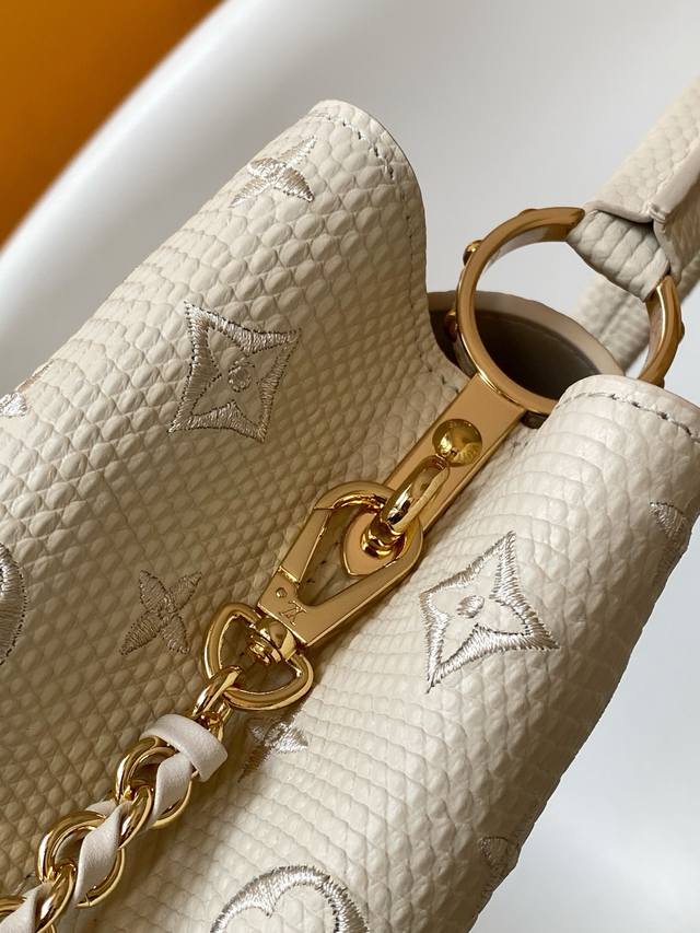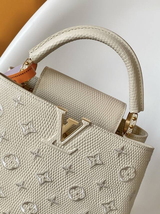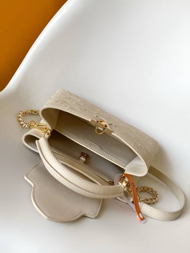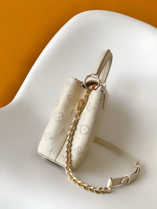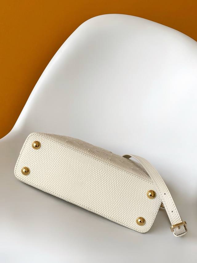 Top-tier original M48865 N86168 Lizard-patterned Capucinesbb handbag exquisitely blends a luxurious lizard skin exterior, a delicate sheepskin lining, and lustrous metal hardware. The iconic flap creates two distinct styles: an interior display of the Louis Vuitton logo and an exterior display of blooming Monogram flowers for a striking evening look. Size: 27 * 18 * 9 cm (Length x Height x Width)