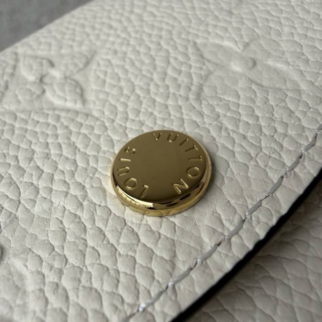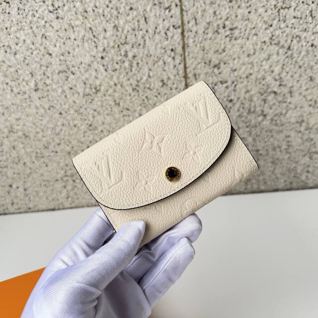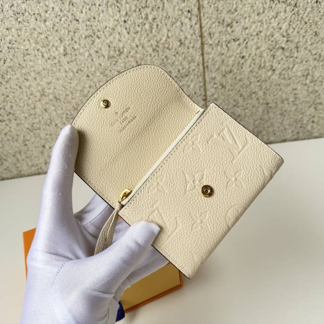 Top-tier original M81445 white Rosalie coin purse is crafted from Monogram Empreinte embossed soft-grain cowhide leather. It features a compact design with a rounded flap closure, an interior zippered coin pocket, a slip pocket, and a card slot. A Louis Vuitton logo snap closure ensures secure opening and closing. Dimensions: 11 x 8 x 2.5 cm. DDD