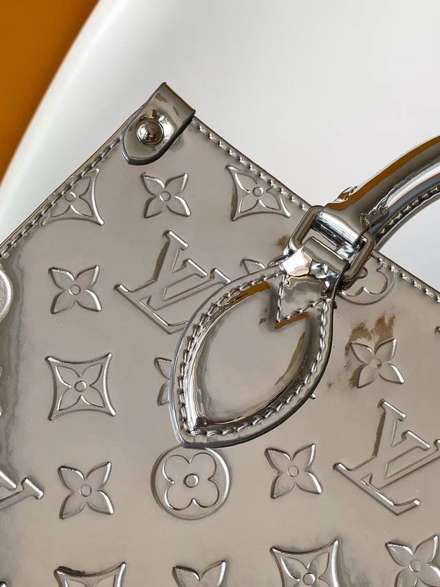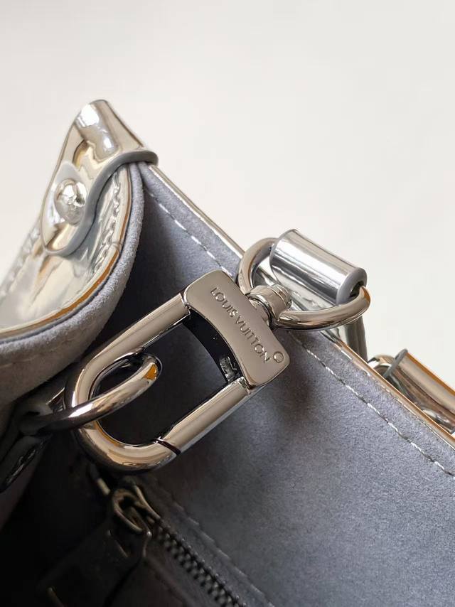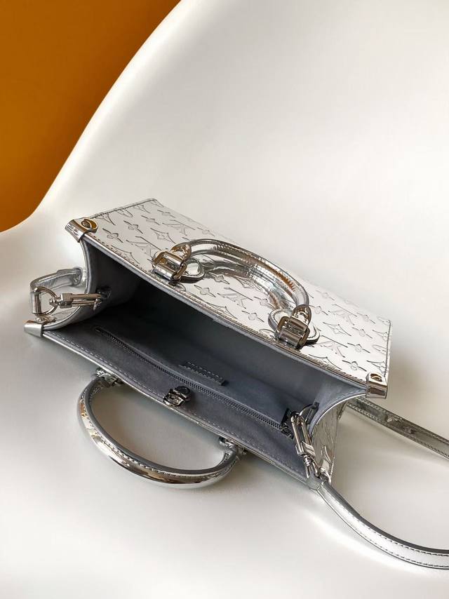 Top-tier original, variable code chip M26373 silver. This Onthego small handbag joins the Lv Ski series in a Monogram Miroir version. Coated canvas ensures durability. The silver hue and matching metal hardware create a shimmering effect. An interior pocket can hold small books and other everyday essentials. Dimensions: 19 x 11.5 x 25 cm (H x W x Length). Coated canvas trim. Fabric lining (cotton and polyester). Metal hardware. Snap closure. Zippered interior slip pocket. Can hold a 6.7-inch smartphone, earphones, Sarah's long wallet, small book, keys, and lipstick. Shoulder strap: Detachable, non-adjustable. Strap half-length: 51.0 cm. Handles: Double handles.