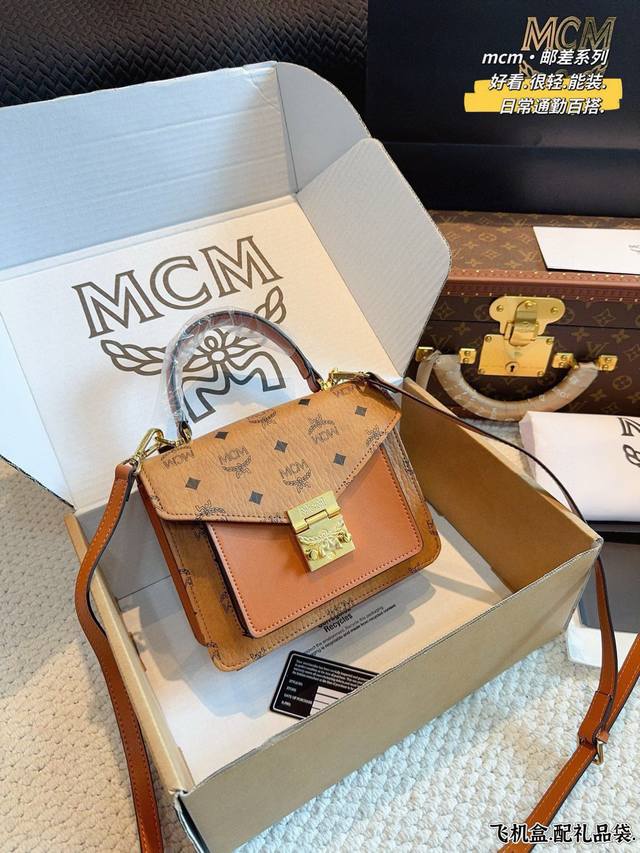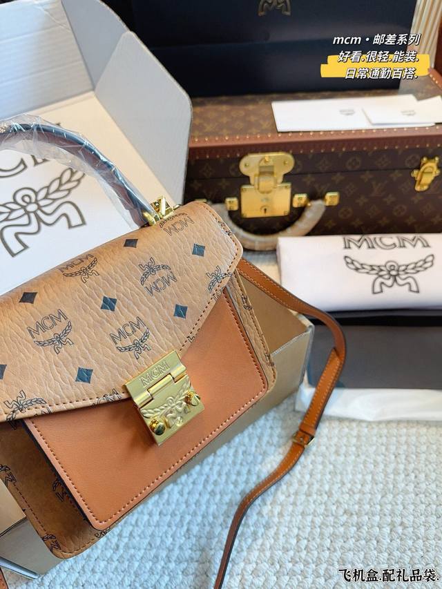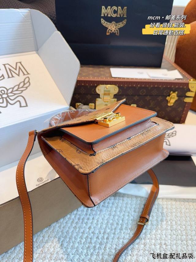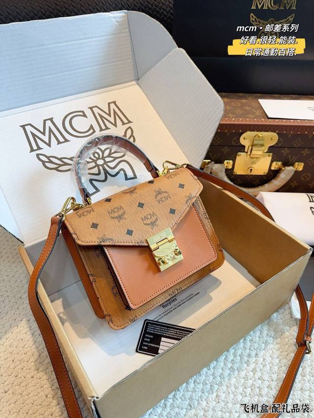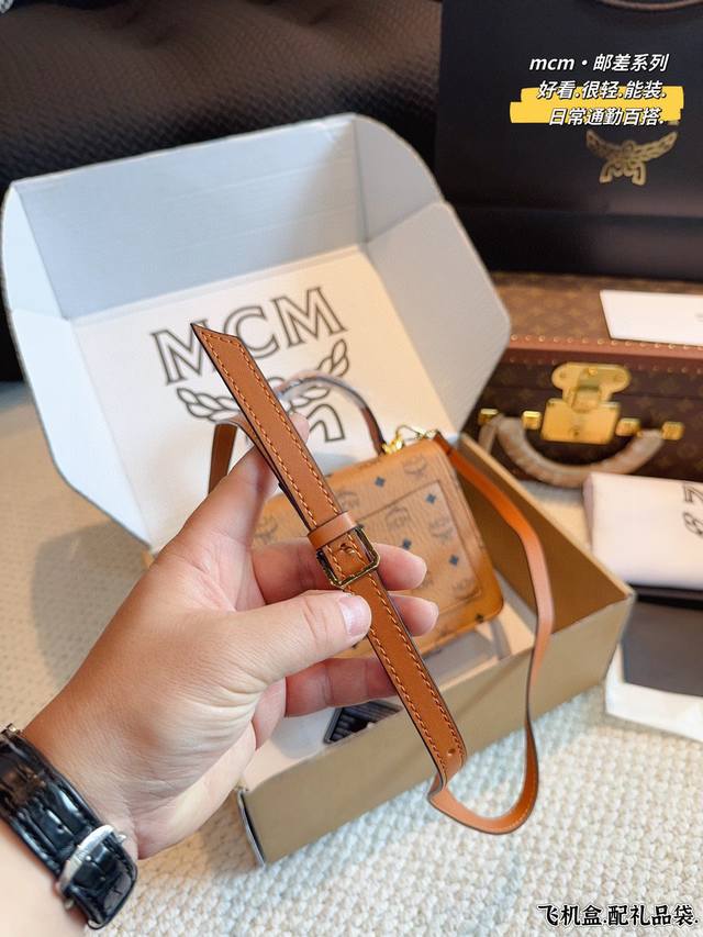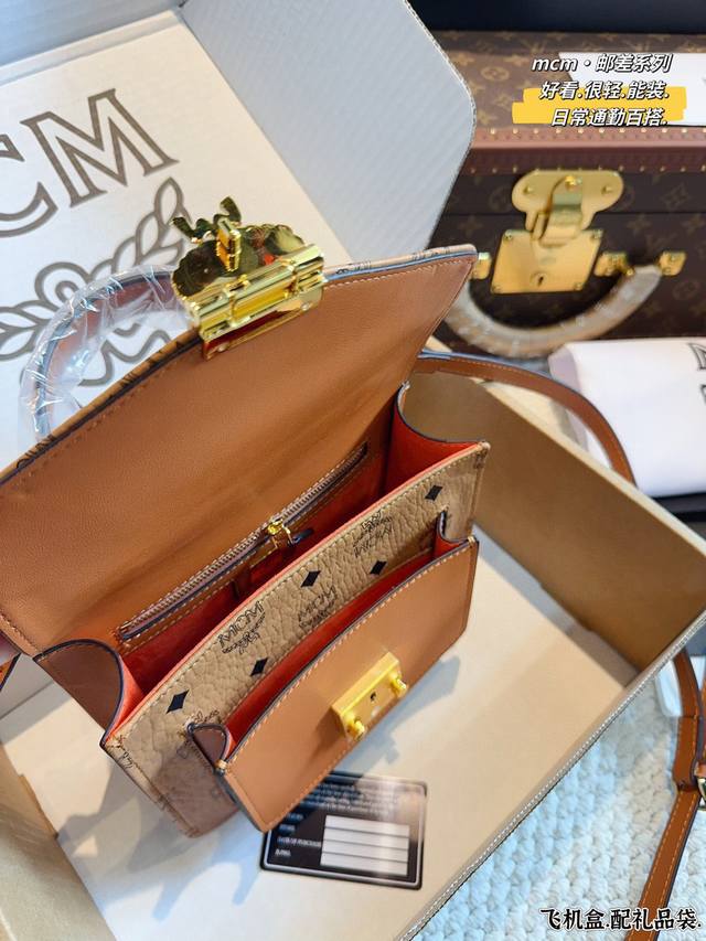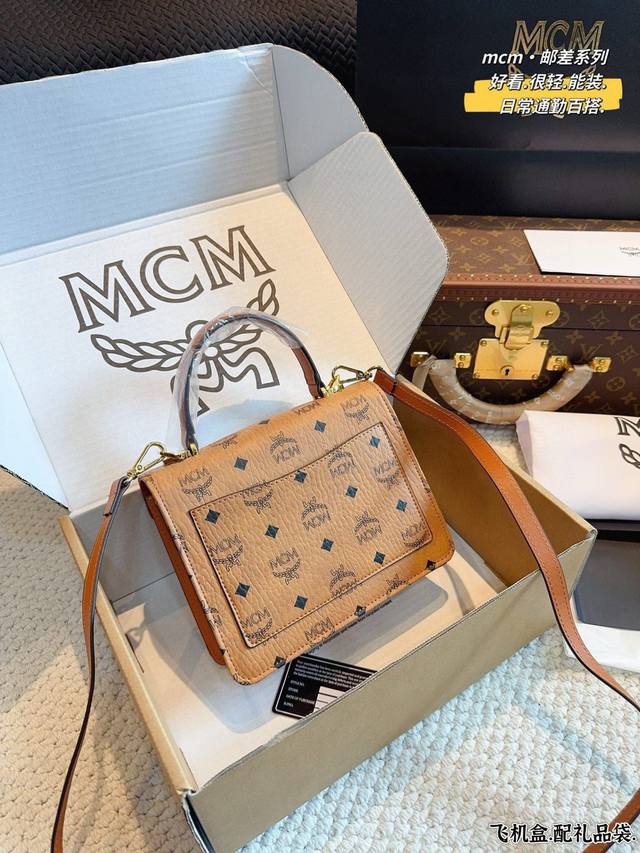 Mcm messenger bag, beautiful and practical. Classic & studded front flap design for perfect privacy. Accordion-style compartments offer ample space. Detachable and adjustable shoulder strap. Sturdy texture with a layered look, very elegant when worn. Perfect for commuting, easily switch between crossbody and hand carry. Pairs perfectly with a coat for a stunning look. Dimensions: 21*8*18cm.