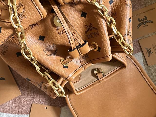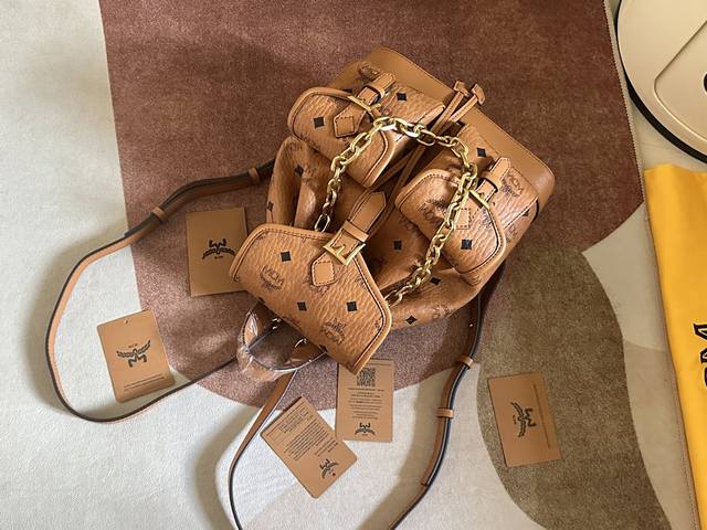 Factory Price. Top-quality original leather, top-grade original single item with complete boutique packaging. Style No.: 2197. Ddd Mcm original single item, 2025 new drawstring backpack. This Visetos classic pattern faux leather multi-functional backpack features a detachable chain handle, detachable shoulder strap, and natural leather trim. The classic Ddd bucket bag style is reimagined as a mini backpack with a detachable chain handle. This elegant piece is made from classic Visetos faux leather and natural leather , with buckle hardware inspired by the Munich Bavarian Diamonds adding to the design. The detachable and adjustable shoulder strap allows this compact bag to be used as a crossbody bag or a children's backpack. Ddd Material: PVC with cowhide Ddd Color: Cognac Ddd Size: 25X23X11Cm DDD