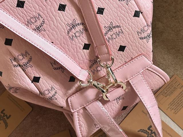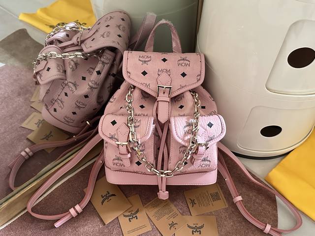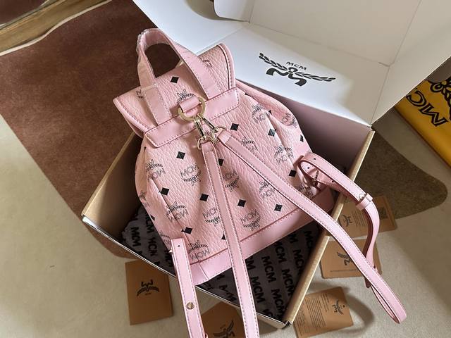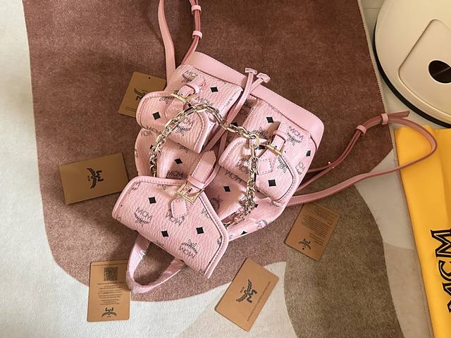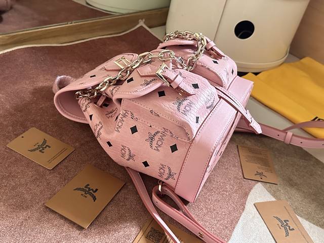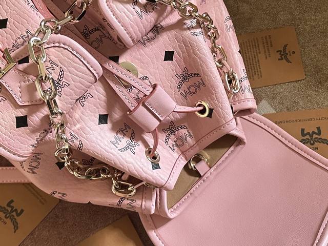 Factory Price. Top-quality original leather, top-grade original single item with complete boutique packaging. Style No.: 2197. Ddd Mcm original single item, 2025 new drawstring backpack. This Visetos classic pattern faux leather multi-functional backpack features a detachable chain handle, detachable shoulder strap, and natural leather trim. The classic Ddd bucket bag style is reimagined as a mini backpack with a detachable chain handle. This elegant piece is made from classic Visetos faux leather and natural leather, with buckle hardware inspired by the Munich Bavarian Diamonds adding to the design. The detachable and adjustable shoulder strap allows this compact bag to be used as a crossbody bag or a children's backpack. Ddd Material: PVC with cowhide Ddd Color: Cherry Pink Ddd Size: 25X23X11Cm DDD