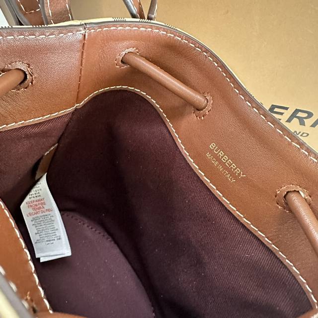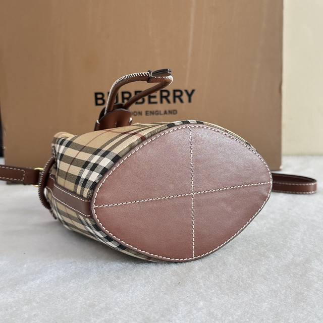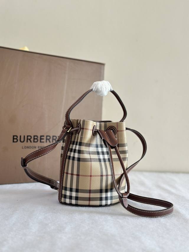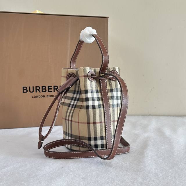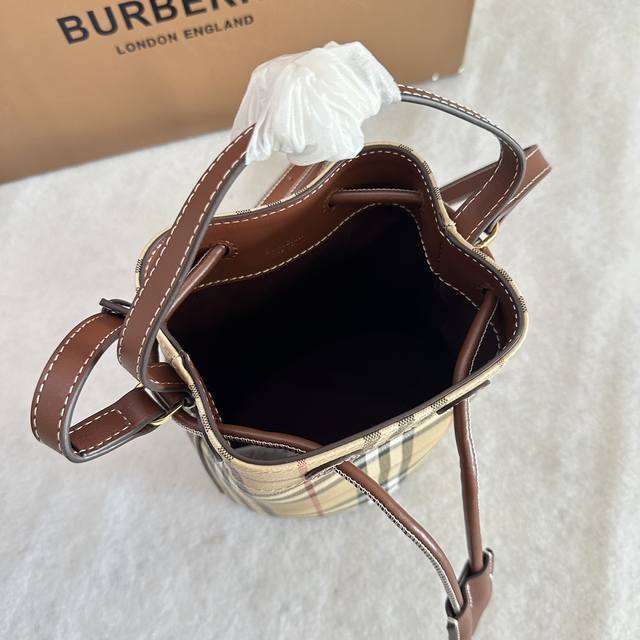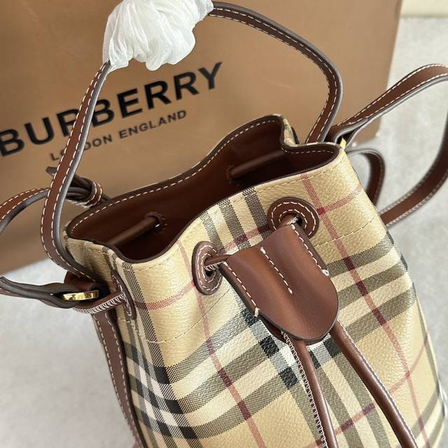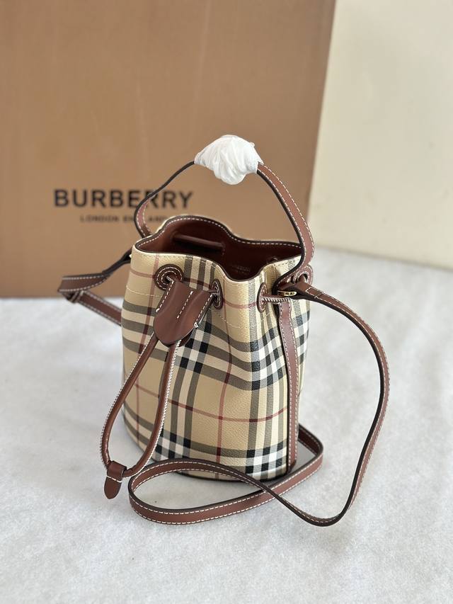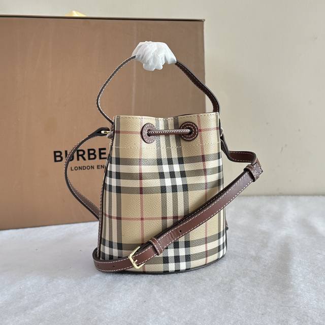 Original B bag Mini check bucket bag, made from coated cotton blend. Crafted in an Italian workshop, decorated with Burberry check print. Soft and stiff, lined with cotton. Drawstring closure with leather shield buckle. Carry by the top handle or carry it crossbody with the detachable shoulder strap. Top leather handle. Removable and adjustable leather crossbody strap. Drawstring closure. Hand-painted painted edges. Glossy metal hardware. Cotton lining. Dimensions 16.5 X 11 X 18.5Cm