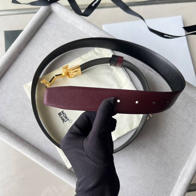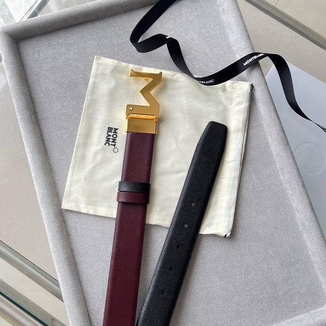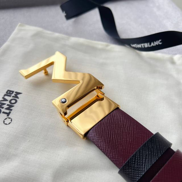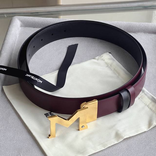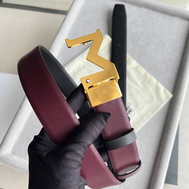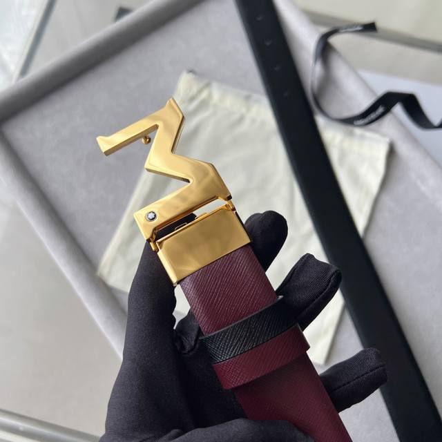 Black double-sided leather strap with "M" pattern buckle, 35mm
