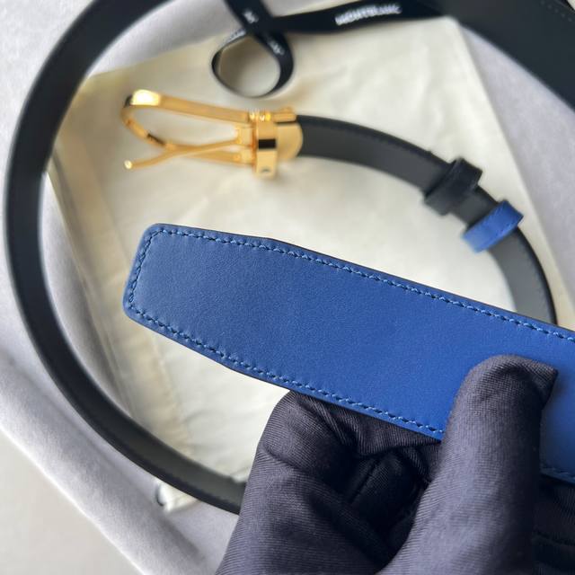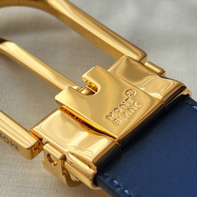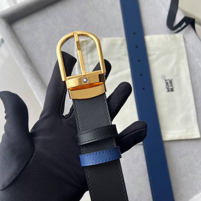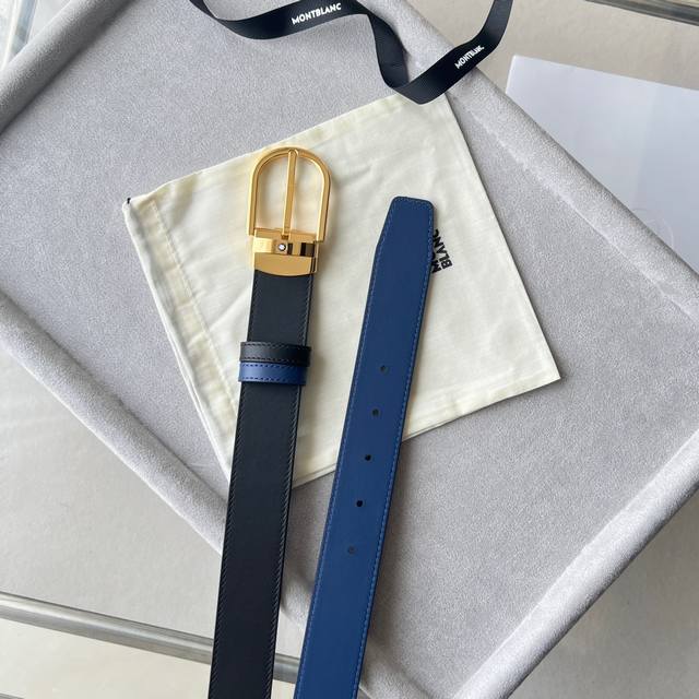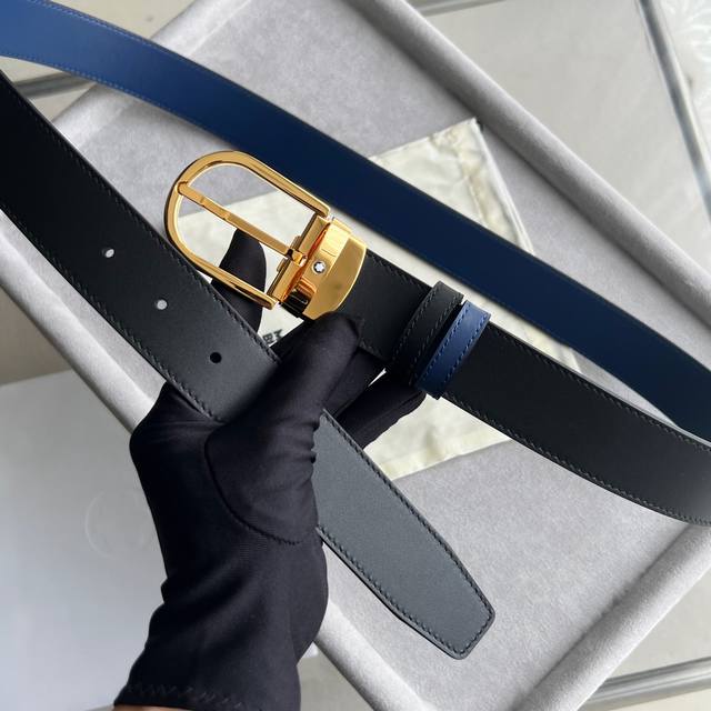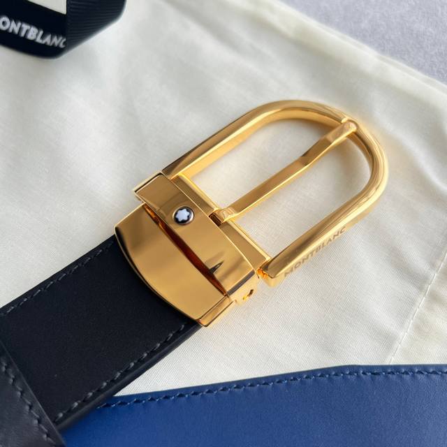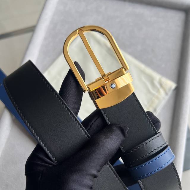 Horseshoe-shaped buckle, black and blue, reversible leather strap, 35mm