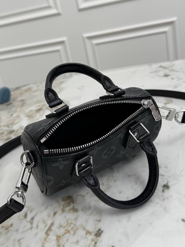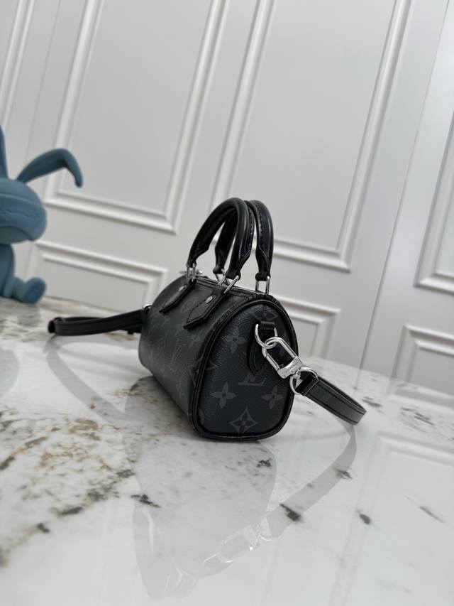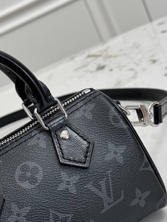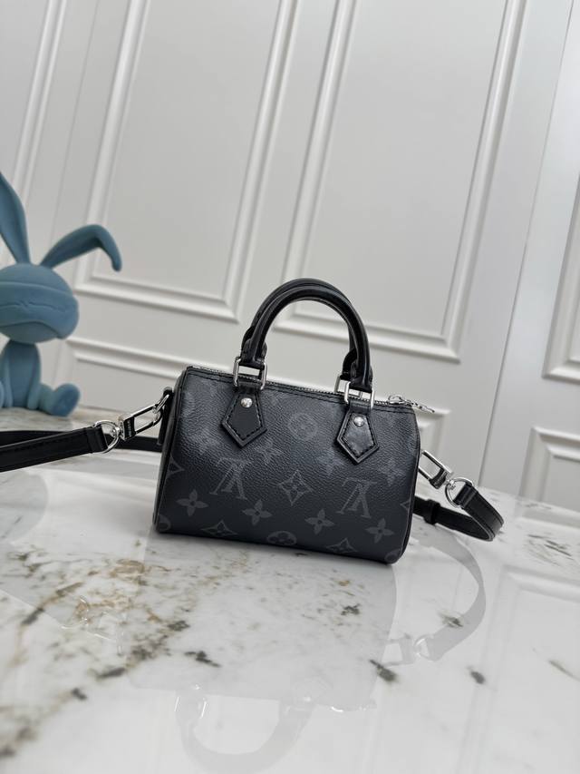 163C01 Dynamic Chip M26573 Top-tier original, genuine product. This Nano Speedy handbag features a sleek canvas design with an elegant Monogram Eclipse pattern, effortlessly brightening your look for day or night. Lustrous metal hardware exudes sophistication. Ample space accommodates everyday essentials like a short wallet, and the detachable shoulder strap allows for multiple carrying options. Monogram Eclipse pattern