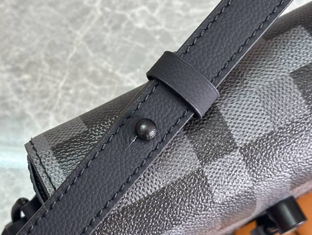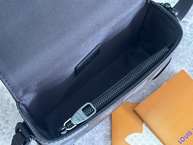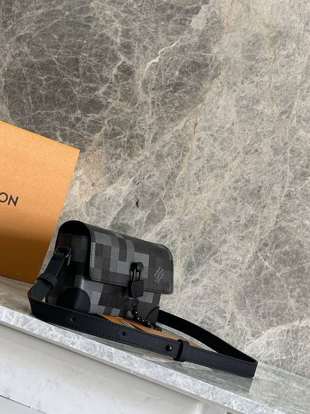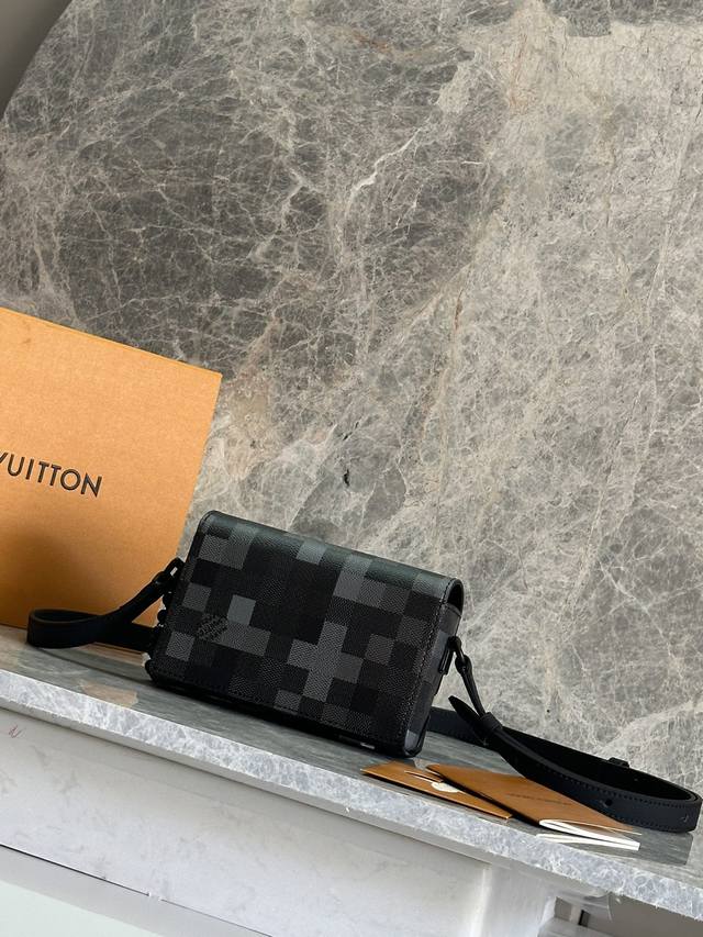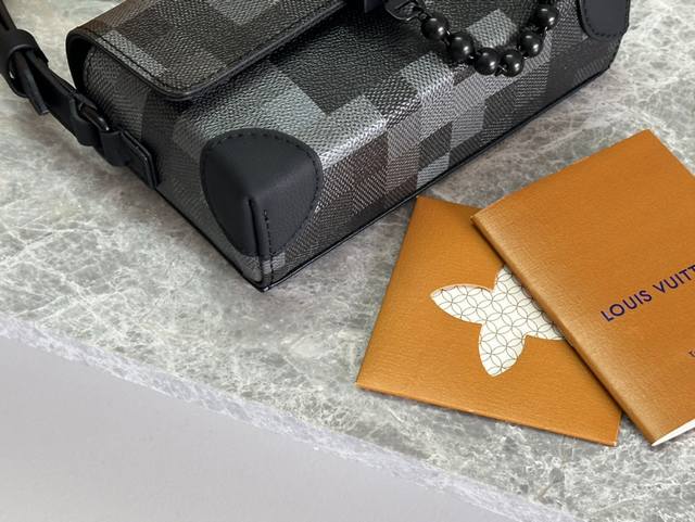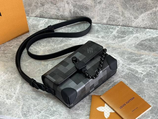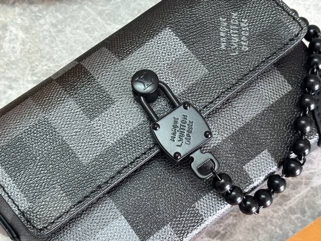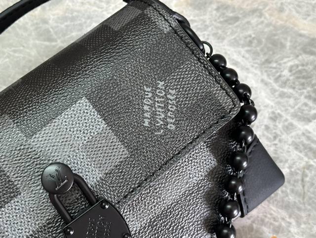 163C01 Dynamic Chip Top. This Steamer mini bag showcases the elegant and sophisticated design of Pharrell Williams in Damoflage Black coated canvas. The pixelated Damier Graphite pattern creates a modern look. The square lock clasp connects to the delicate bead chain, and the adjustable shoulder strap allows for shoulder and crossbody wear. Model No. 14923 Dimensions: 18 x 11 x 6.5 cm (Length x Height x Width
