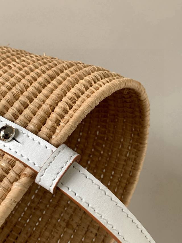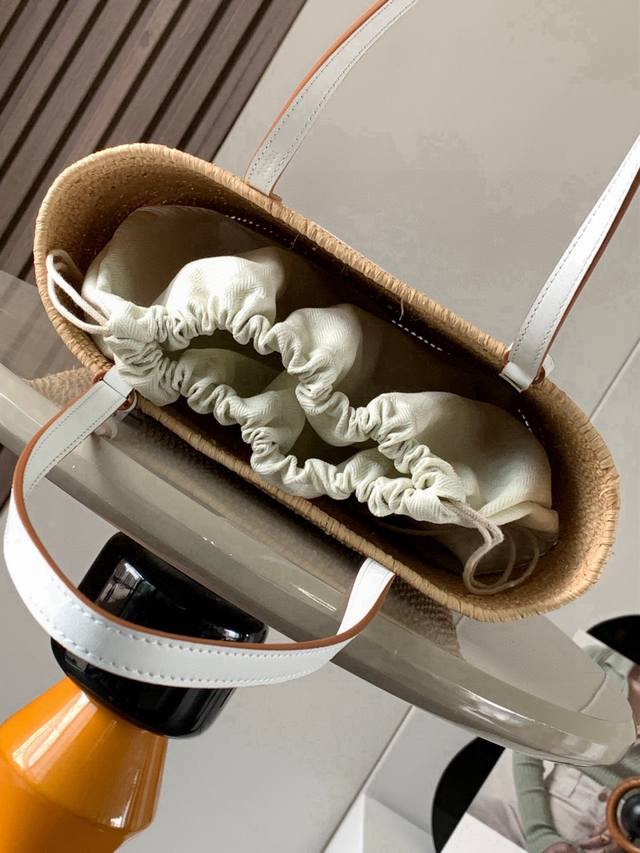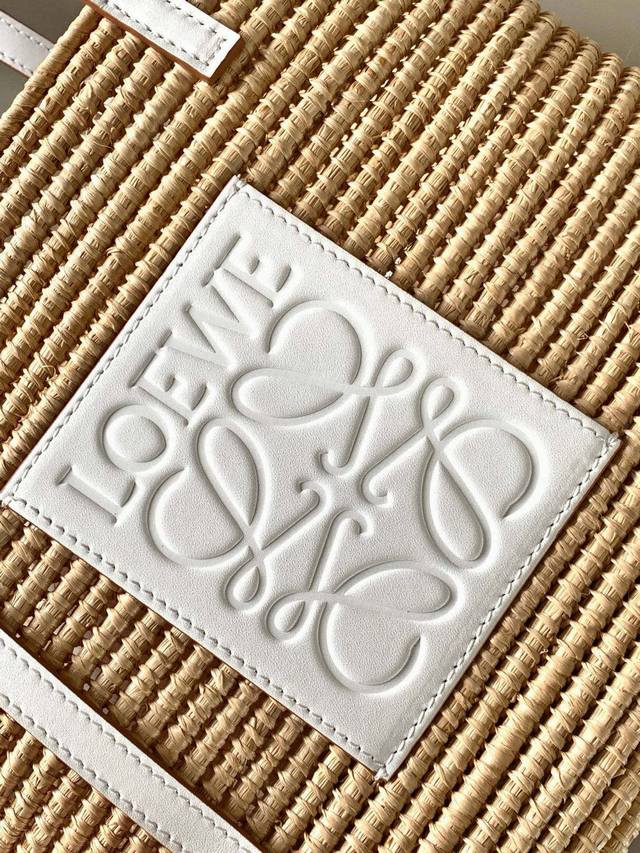 A popular small raffia and cowhide square basket handbag. This compact square basket handbag is crafted from pure hand-woven raffia and cowhide leather. It's simple and elegant, yet lightweight, and its simple yet sophisticated design evokes a Korean style. This bag instantly captures your sense of style and is perfect for travel and photo opportunities. The adjustable strap length makes it a stylish accessory for outings or commuting. The Square Basket is a must-have for beach vacations. A casual bag is essential for any beach vacation. It can hold not only a water bottle but even a small umbrella. The simple design, accented by the L0Ewe logo, makes it a stylish accessory for women of all ages. Material: Natural plant-based raffia. Size: 27-20cm. Style: 8001. Color: White.