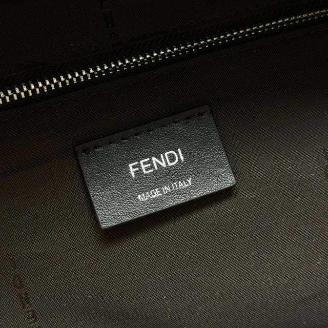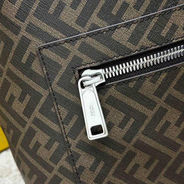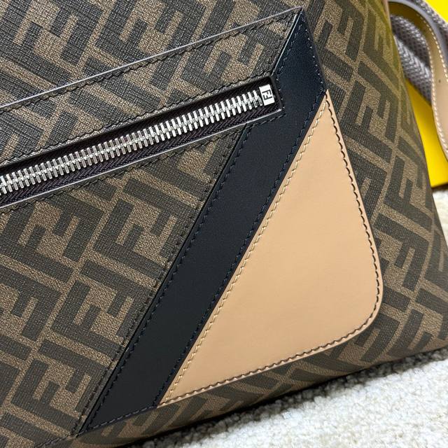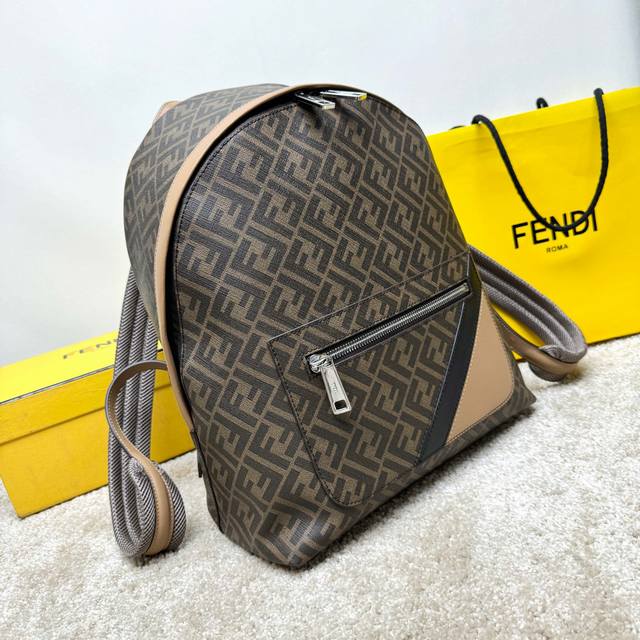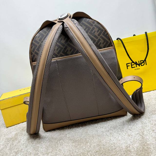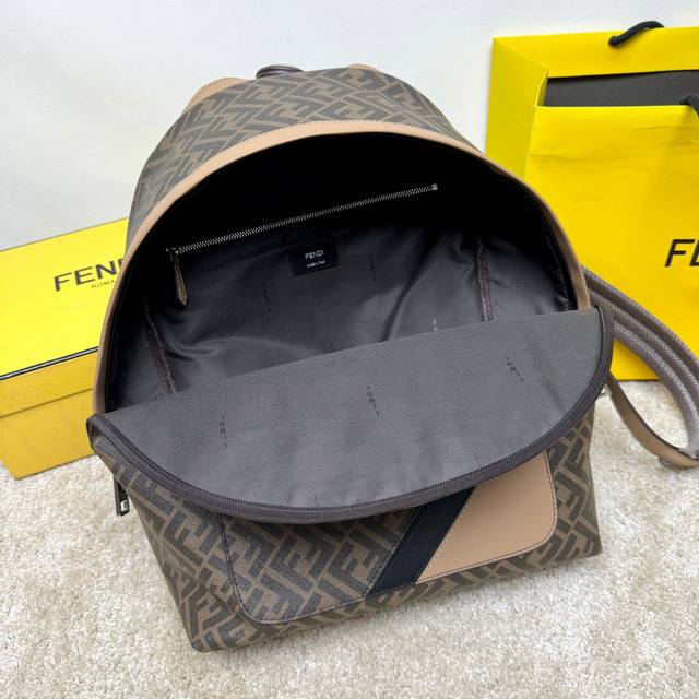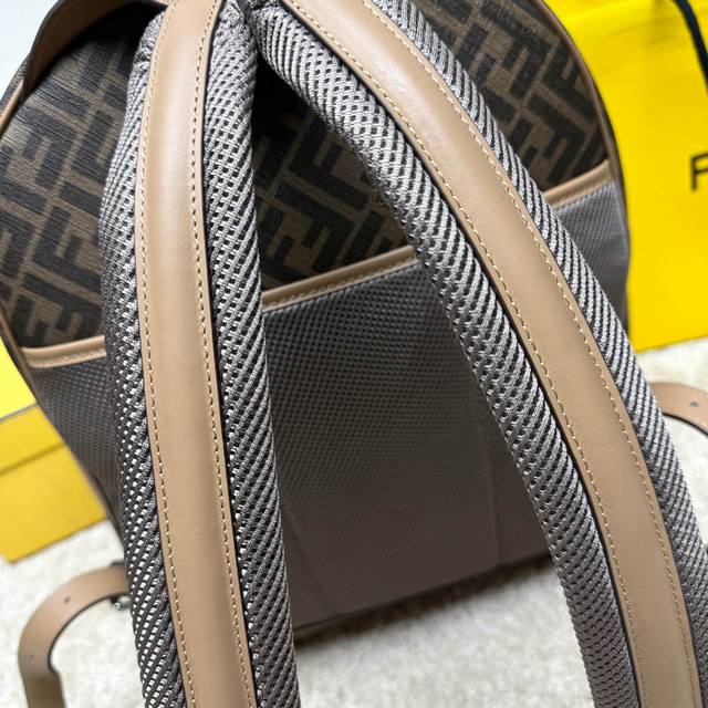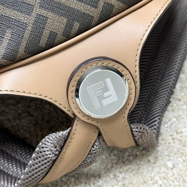 A spacious, structured backpack. This design features a metal rivet engraved with the Ff logo, which allows the two shoulder straps to become one, transforming it into a one-shoulder style. Made of brown Ff canvas with beige leather details. The front zip pocket is decorated with a black leather diagonal inlay. It features a two-way zip compartment, an internal zip pocket, and a padded compartment with a 13-inch laptop opening on the back. Silver-finished hardware. The handle is matched with a shoulder strap with a slide adjustment, allowing this handbag to be carried by hand, on one shoulder, or over a backpack. Made in Italy