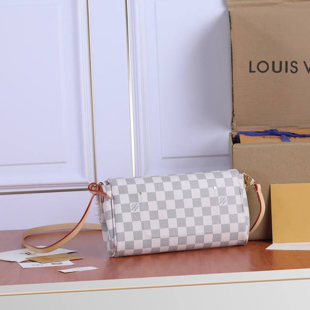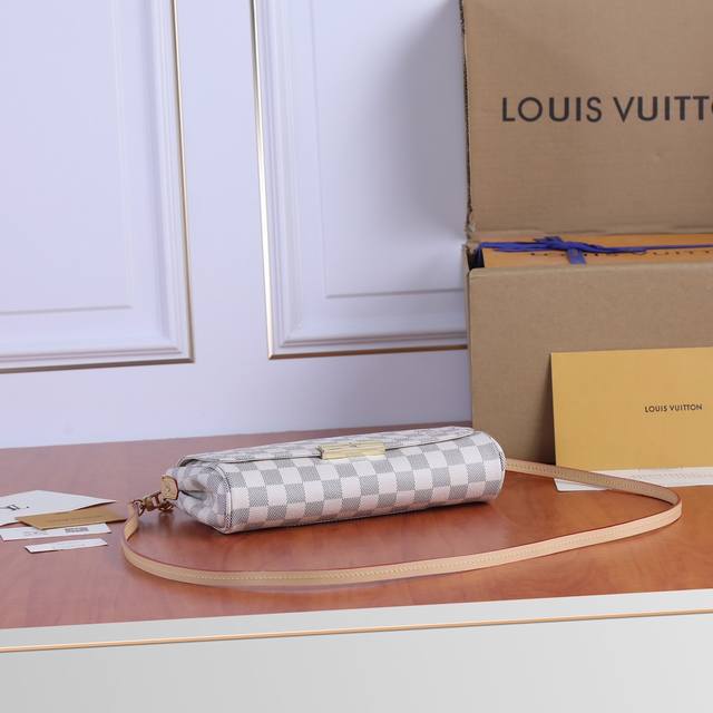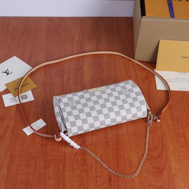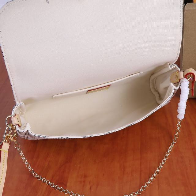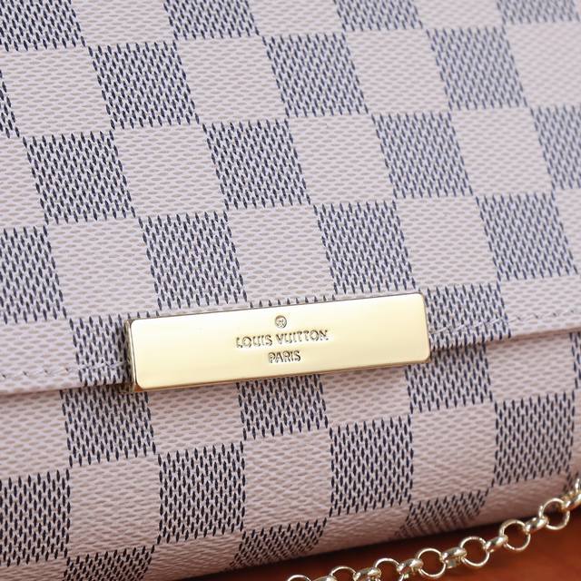 Authentic quality. This Favorite medium handbag is crafted from Monogram canvas and can be carried by hand or on the shoulder. It features a detachable shoulder strap and metal chain. It's an elegant everyday carry. It features a magnetic clasp, brass hardware, natural calfskin trim, and a flat interior pocket. Model: M40718; Dimensions: 28 x 15 x 4 cm.
